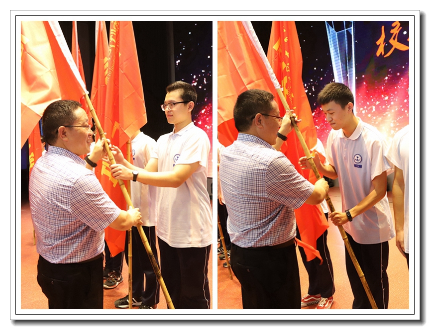 紧接着校领导依次向各班班长授旗。