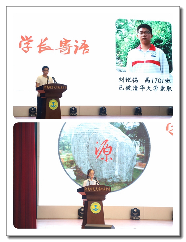 2020届学生代表刘铠铭同学代表学长学姐与学弟学妹们分享征战高考的经验,并为高三的同学们摇旗呐喊、加油助威。2021届高1801班黄千云同学则代表高三全体同学做出征宣言,表达了同学们积极进取、永不言败、勇往直前的决心。