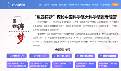 来自海峡两岸及港澳地区的1.3万名高中生和领队老师以及全国广大青少年齐聚网络终端,共同参加2020年青少年“云上科学营活动”开营仪式。2020年高校科学营活动充分利用互联网技术的赋能优势, 由线下改为线上组织,用“虚拟大学城”的形式集中呈现。领导嘉宾共同启动2020年青少年“云上科学营活动”,中国科协副主席、书记处书记孟庆海代表主办单位宣布开营。开营式以直播的形式向全国公众和青少年开放。