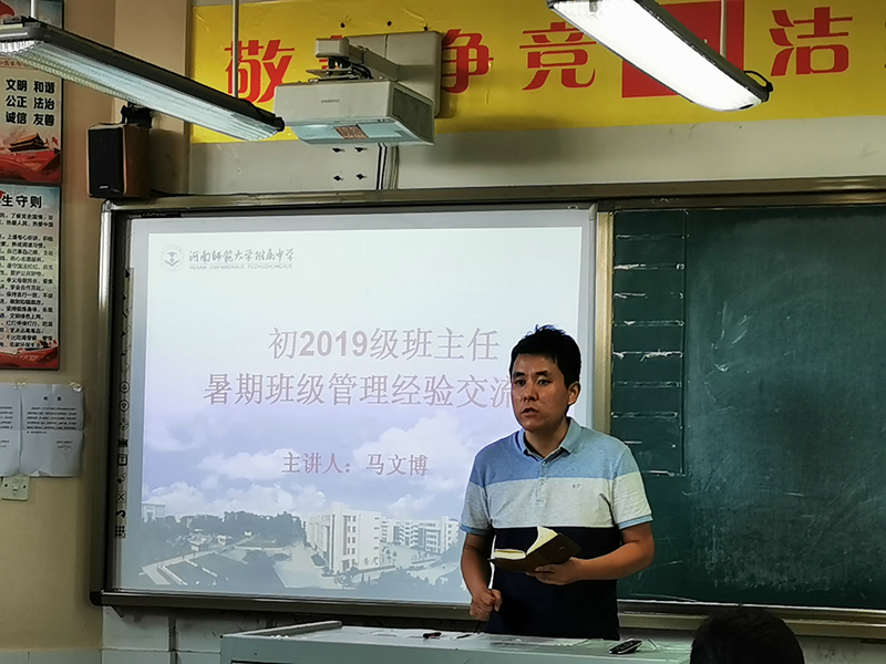 会议首先由付玉梅老师发言。作为一位物理老师,她针对新初二学生新增物理学科的问题向各位班主任提出了具体的学科学习要求的建议,以供参考。付老师特别强调学习物理需要多观察生活联系实际,多思考多做题。接下来由王福东老师向大家介绍了中途接班的注意事项,包括三个方面:开学前与班级之前的班主任做好交接工作、接班后做好多项“第一次”(第一节课、第一次班会、第一次家长会等)、做好日常管理工作等。紧接着由马文博老师给大家分享了暑期班级管理工作的经验,比如对学生的作业监督做要求,指导学生制定假期计划、加强家校交流指导学生养成习惯、对核心班委的调整工作等给出了具体建议。