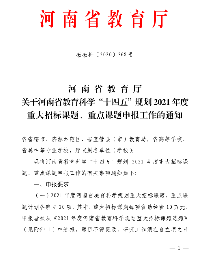 河南省教育厅关于河南省教育科学“十四五”规划2021年度重大招标课题、重点课题申报工作的通知