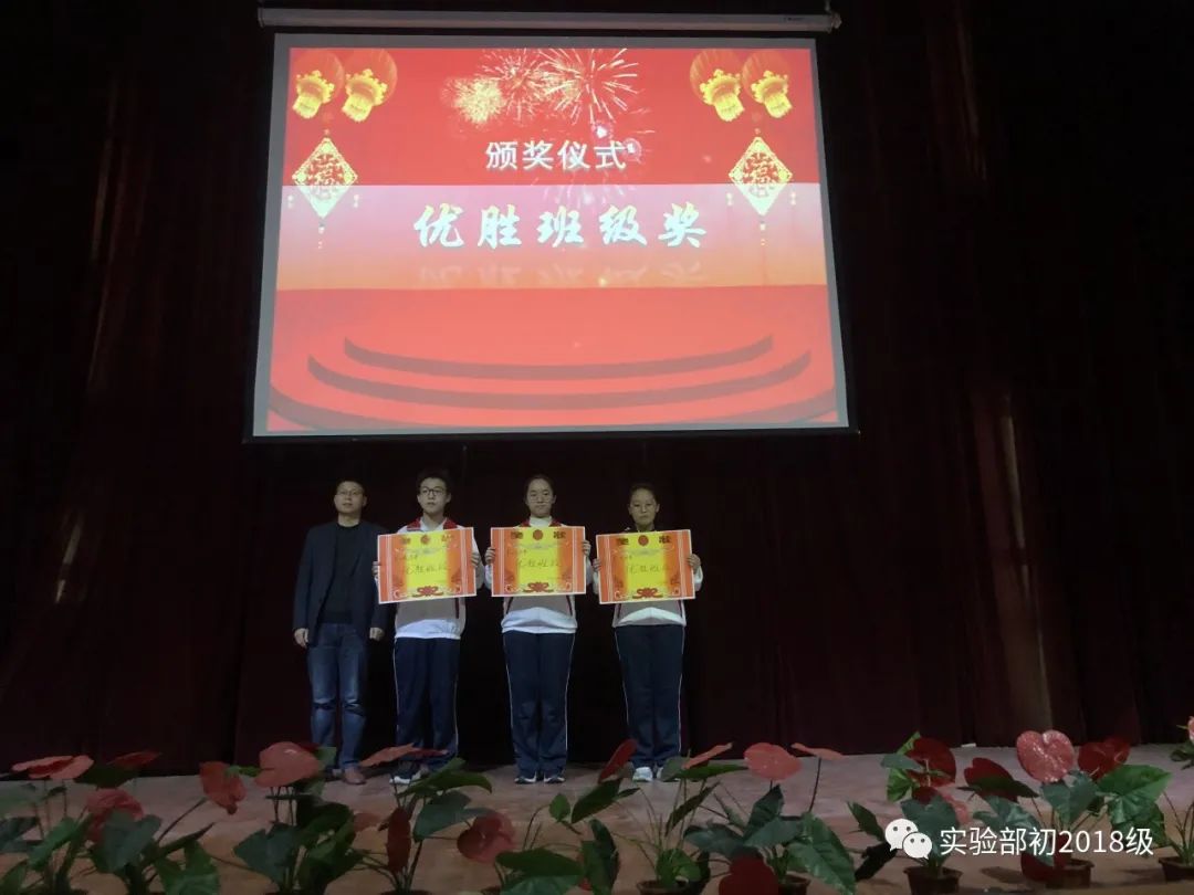 获得学习二等奖、学习一等奖、学习特等奖的同学依次上台领奖。获得优胜班级奖的班级代表与年级主任合影留念。