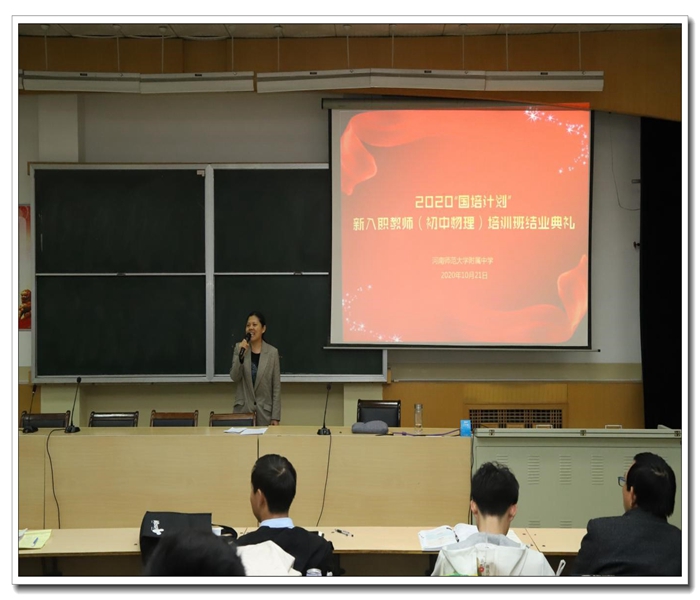 2020年10月21日上午,在办公楼四楼阶梯教室,李小丹老师主持《2020“国培计划”新入职教师(初中物理)培训班结业典礼》,并与刘新选老师一起为优秀学员、微型课比赛获奖者颁发荣誉证书并参与拍照留念。十天前,他们来自河南各地,他们是普通的教师,相聚在师大附中,在香气馥郁的桂花中,开启了一段美妙的培训时光。学员们一起经风雨,看斜阳,一起从霞光里走来,一起从晚霞中回去,他们从一天天地轮回中聚了又散,彼此由陌生渐渐熟悉。相聚是缘,离别必然在彼此熟识时到来,短暂的相逢似乎太匆匆。回望来时的路,恍若昨日,他们好像还来不及回味,可时间之鱼却要从他们的指尖游走。培训的时光就要结束,每个学员都将带着满满的收获,都带着这段珍贵的美好回忆,从这个“场”迁移到另一个“场”,由学员变回老师,回归学校,回归课堂,在教育园地里继续挥洒青春与汗水,再次出发!
