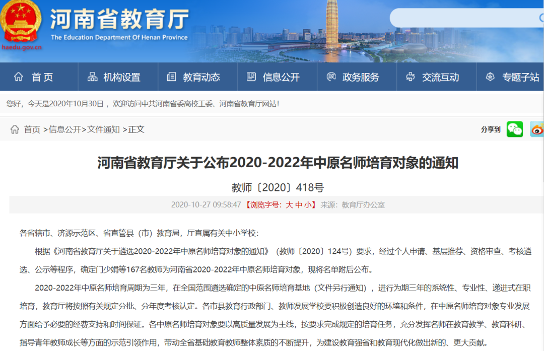 根据《关于 2020—2022 年中原名师培育对象 (幼儿园)遴选考核的通知》(教办师〔2020〕193号)、《关于 2020—2022 年中原名师培育对象(中小学)遴选考核的通知》(教办师〔2020〕206号)要求,省教育厅开展了2020—2022中原名师培育对象(中小学、幼儿园) 的遴选考核,我校石翠芳、王永玉两位老师被确定为中原名师培育对象。这是我校继刘新选、周枫琳两位教师被确定为中原名师之后,又为中原名师队伍注入了新的生力军。