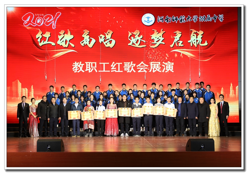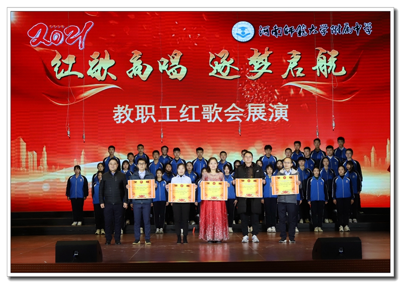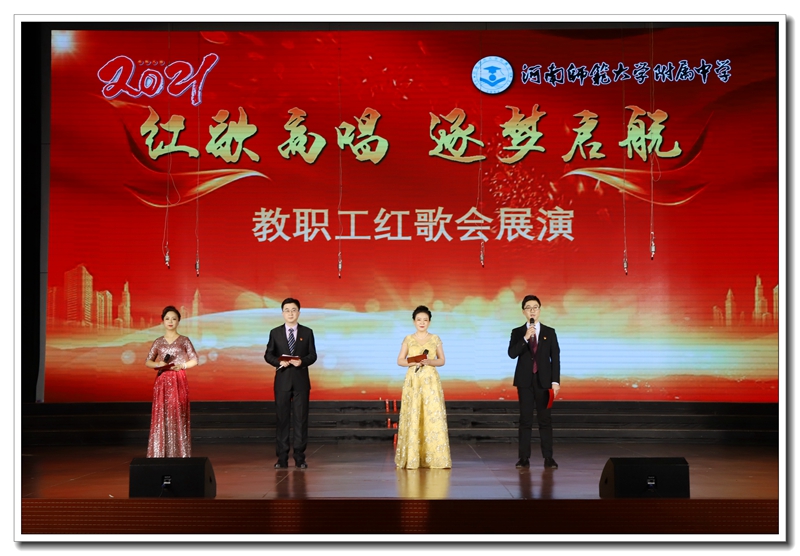 党的十九届五中全会审议通过了我国“十四五”发展规划和2035年远景目标,描绘出社会主义现代化建设美好蓝图,指明前进方向。站在新的历史起点上,为辞旧迎新,同庆元旦,凝神聚力,营造氛围,唱响主旋律,讴歌新时代,丰富教职工的业余文化生活,河南师大附中于12月31日下午在西校区教工礼堂举办了2021年元旦教职工红歌会展演活动。活动由崔彦芳、李雷、史亚楠、范楷四位老师主持。
