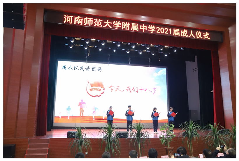 学生代表田梓霖,朱品瀚,郭岩,蒋子阳朗诵了《今天,我们十八岁》。激昂的朗诵让学生年轻的火力奔涌激荡,催人奋进。