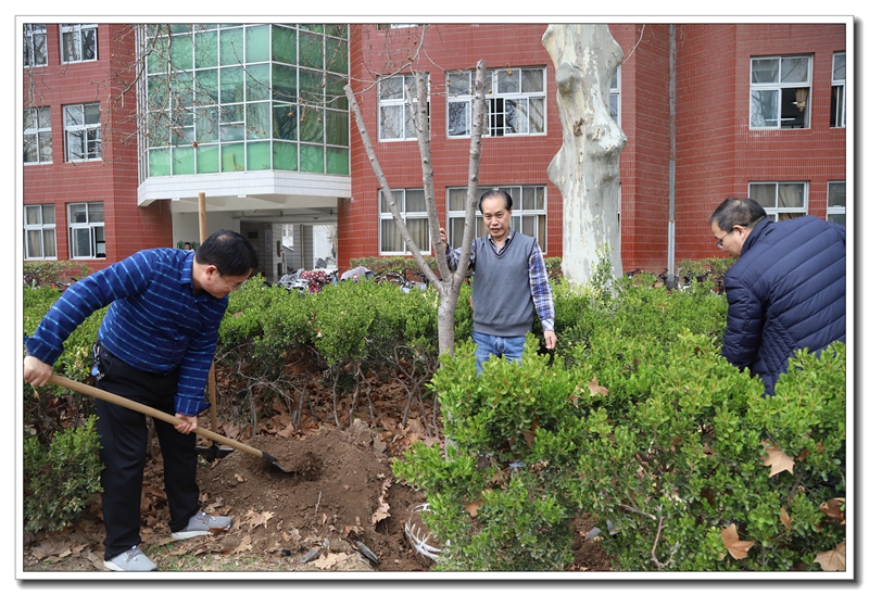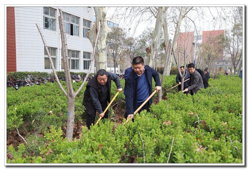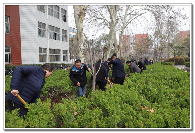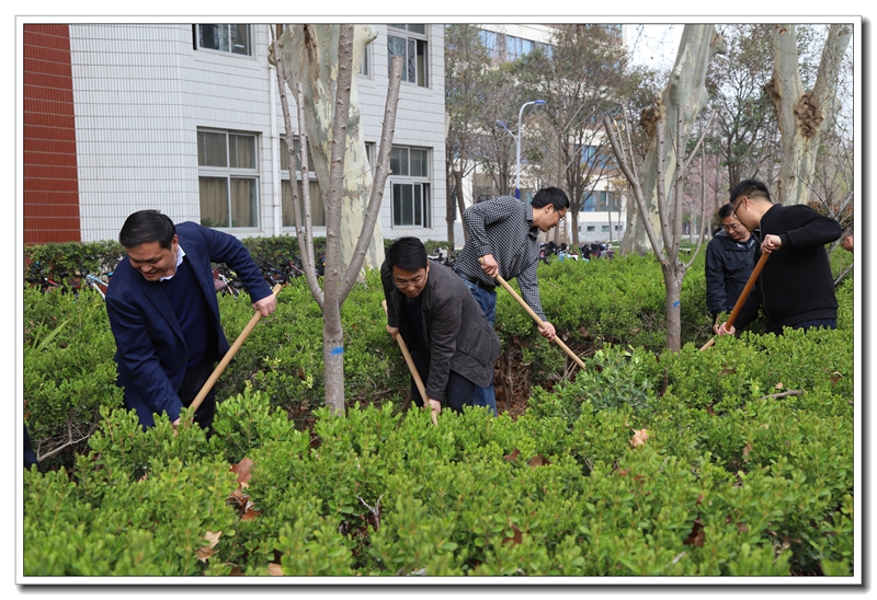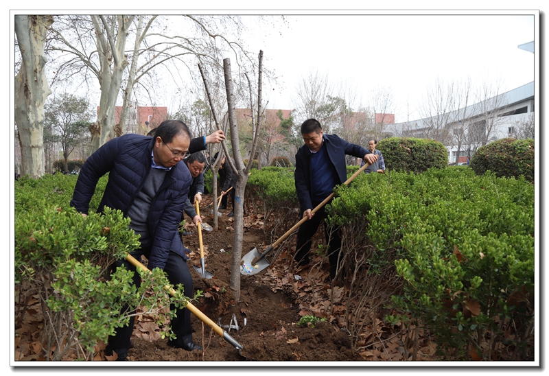 阳春三月,草长莺鸣。3月12日,学校领导谢友海、李杰明、刘齐晋、杨呈杰、陈景任、侯伟及部分中层干部来到二号楼南面的花园参加义务植树活动。