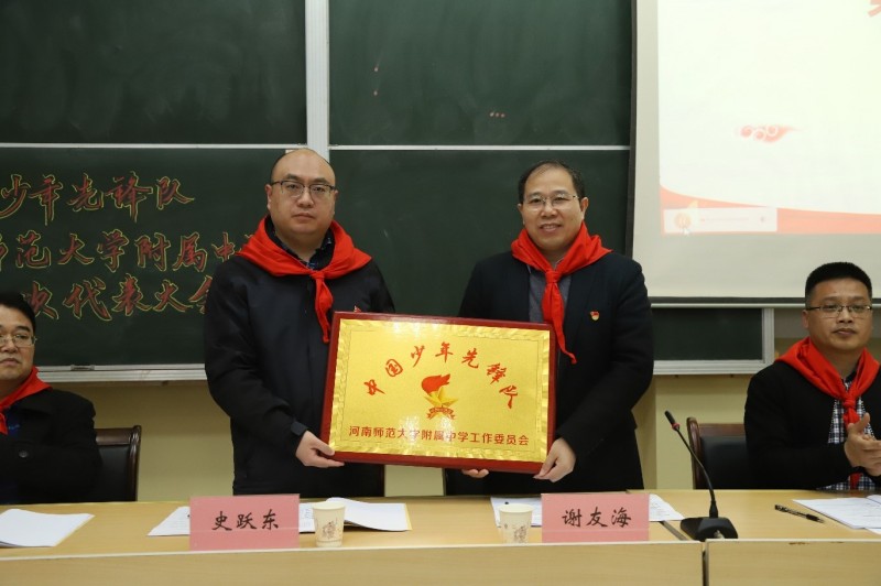 史跃东向中国少年先锋队河南师范大学附属中学第一届工作委员会授牌。