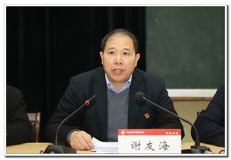 就全校党史学习教育谢友海提出三点要求:一是压紧压实责任,坚持党员领导干部带头学,确保学习教育“动”起来。二是突出学做结合。把党史学习教育和学习贯彻习近平总书记重要讲话精神紧密结合起来,和持续建设“中原强校、中国名校”的愿景结合起来,把学习教育成果转化为攻坚克难、干事创业的强大动力,确保学习教育“深”起来。三是创新方式方法,注重选取一些紧随时代步伐、紧贴时代要求的方式方法,做到规定动作不漏项,自选动作有特点,确保学习教育“实”起来。