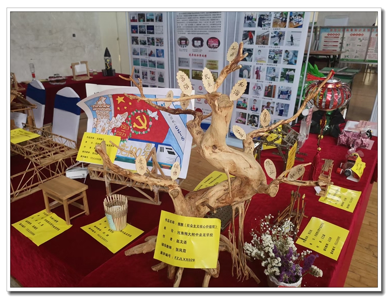 活动现场,我校学生代表一个个精神饱满,情绪高昂,积极参与到现场作品展演活动中。这些作品中有工艺精美的根雕作品《社会主义核心价值观》,有结构精巧的《手摇国旗升降台》,有巧夺天工的木质桥梁、桌椅板凳、亭台楼阁,还有变废为宝的果皮杯垫、多功能笔筒、精美花篮等。除此之外,现场手工自制的美味水果拼盘、蔬菜沙拉、手工装饰画等也吸引了众多观众驻足观看。