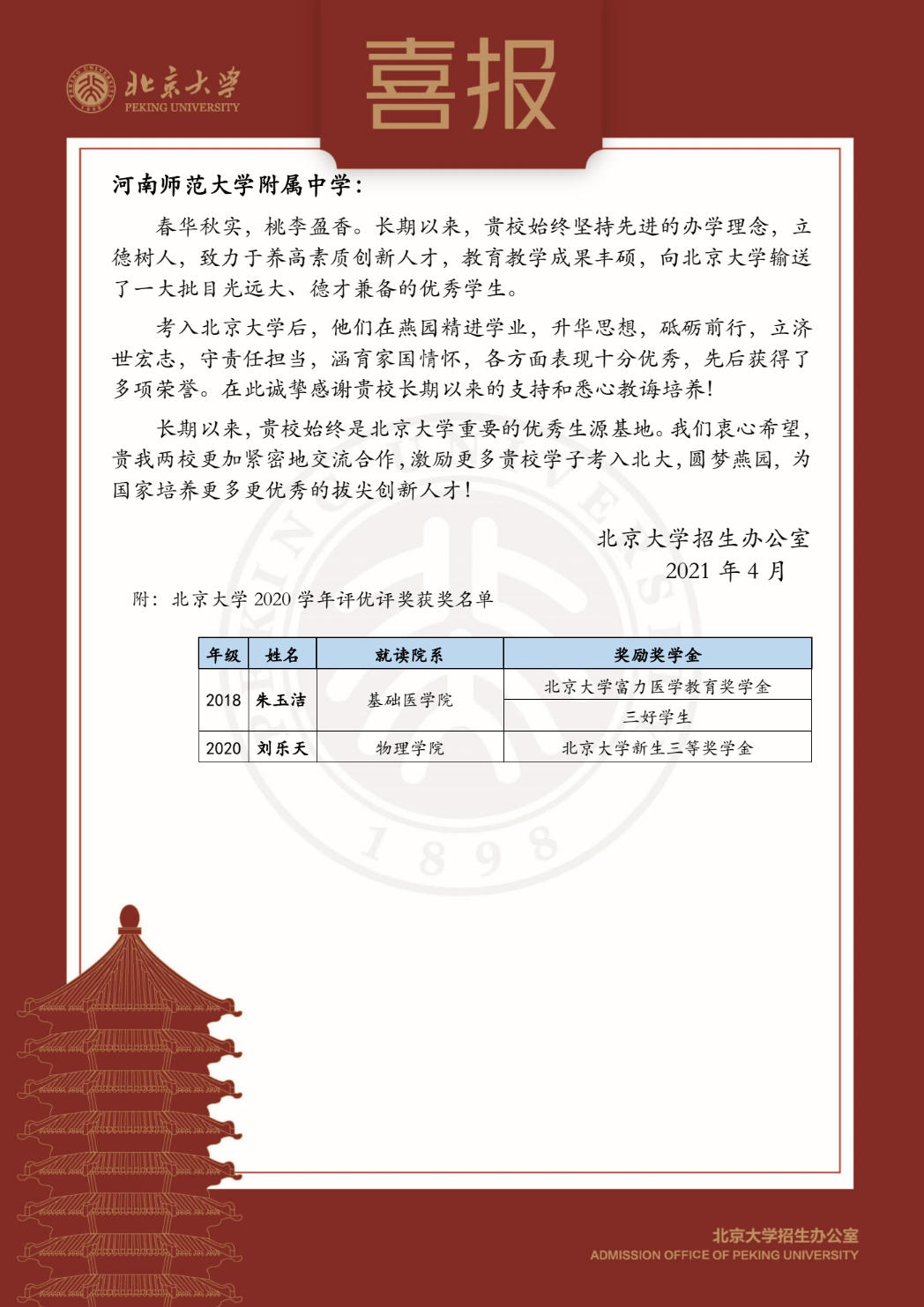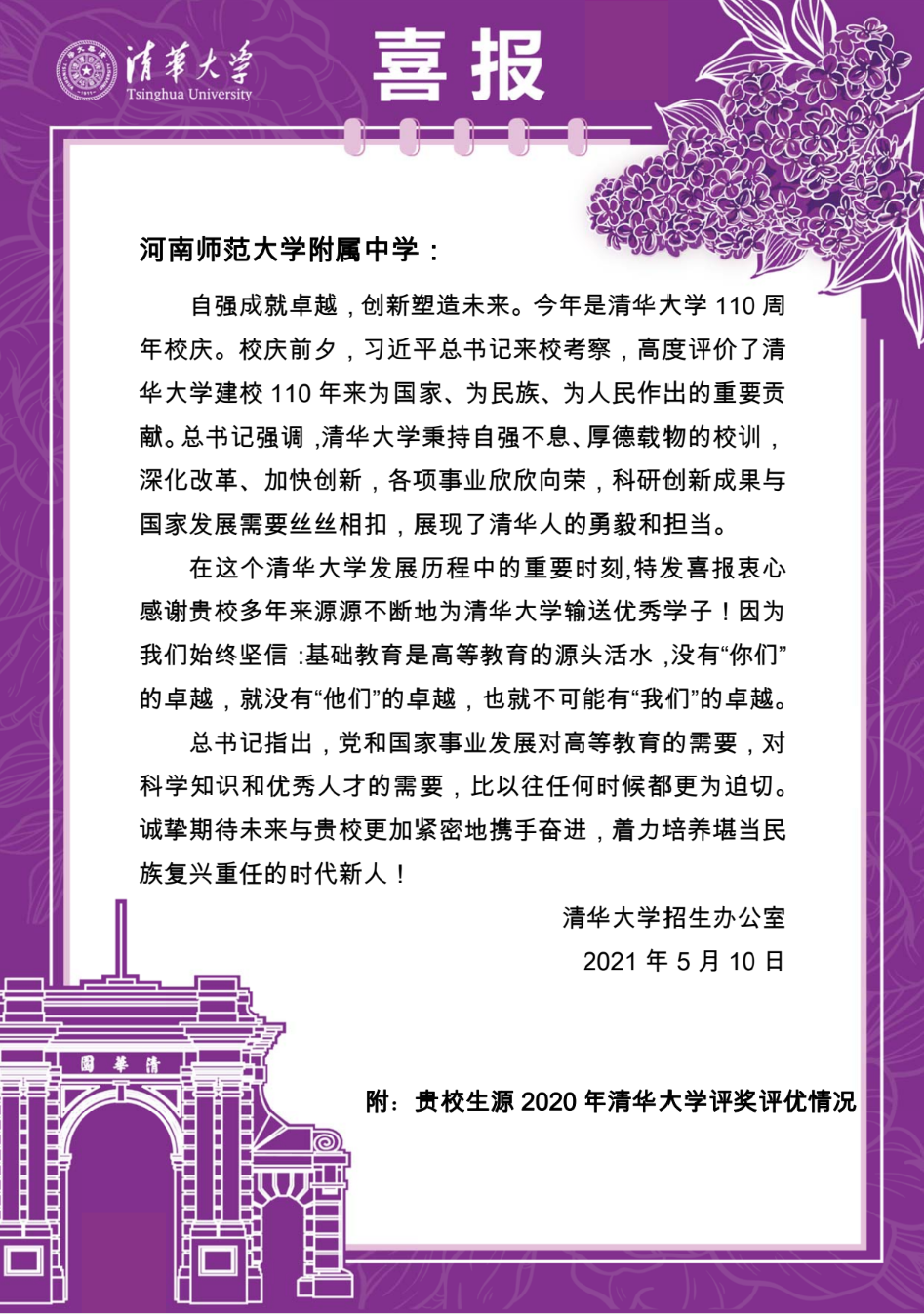 长期以来,我校坚持以内涵发展为抓手,以提高教育教学质量为主题,积极培育学生核心素养,促进学生全面发展。在全体教职工的共同努力下,我校在拔尖创新人才培养方面捷报频传,充分彰显了我校卓越的办学业绩。近期,清华大学、北京大学向我校发来喜报,感谢多年来源源不断地为两所顶尖高校输送优秀学子,现特向全校师生、社会各界报喜。