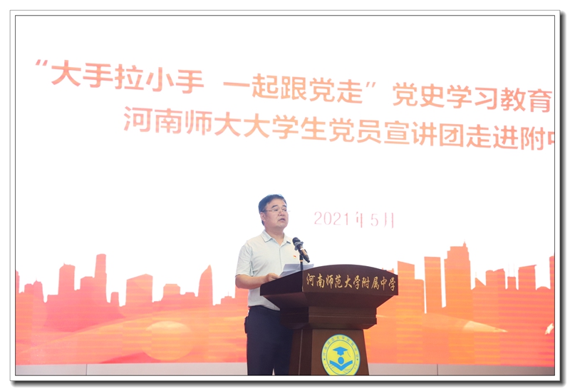 5月31日下午,河南师大大学生党员宣讲团走进附中开展了主题为“大手拉小手 一起跟党走”党史学习教育主题活动。马克思主义学院党委副书记王秀杰,附中党委副书记、纪委书记、工会主席刘齐晋,马克思主义学院团委负责人曲培栋,马克思主义学院2019级博士研究生、大学生党员宣讲团团长隋延亭参加了活动。本次活动由附中团委副书记周晋阳主持。