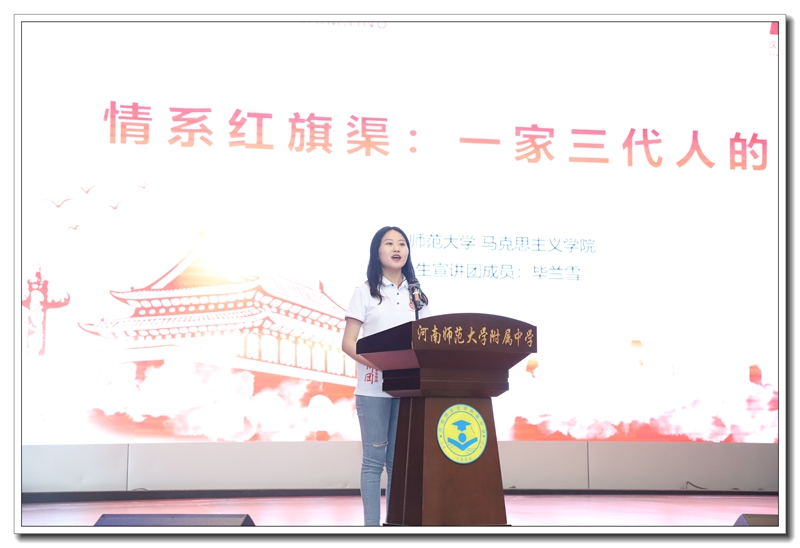 毕兰雪,马克思主义学院2019级硕士研究生,曾获河南省“三好学生”等荣誉,获2019年河南省学校共青团基层团干部微团课大赛(高校组)“特等奖”。她宣讲的题目是:《情系红旗渠:一家三代人的坚守》。