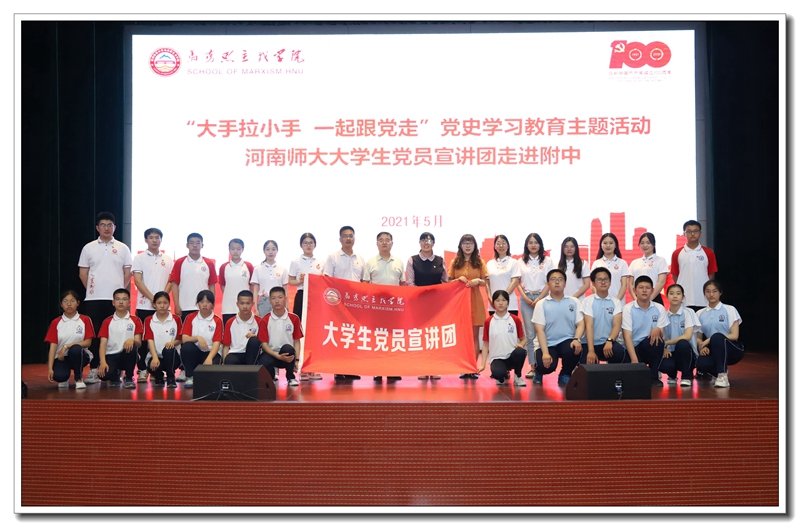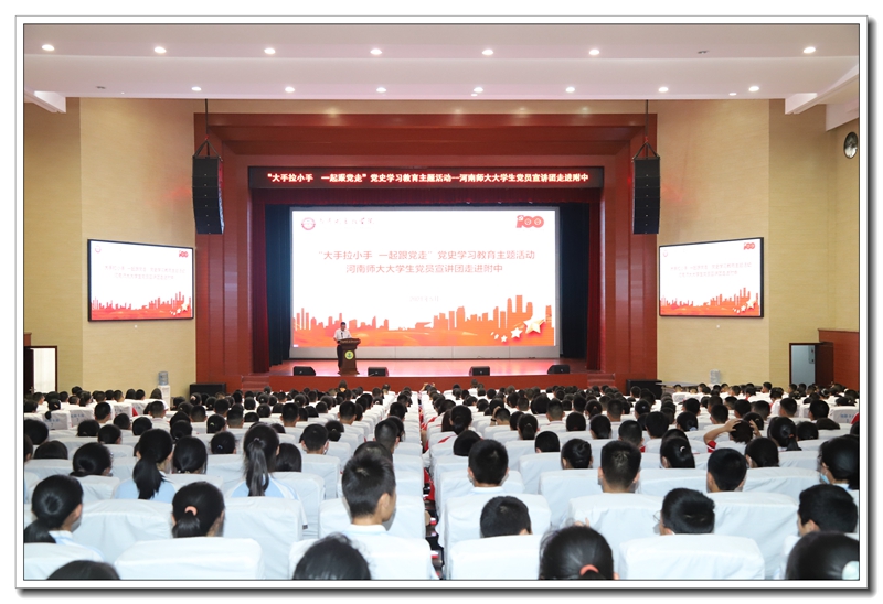 今年是中国共产党百年华诞,“大手拉小手 一起跟党走”是河南师范大学党史学习教育的特色活动之一,由宣讲团深入到大学生、中小学、社区进行党史宣讲,把相对宏大的教育内容通过一个个生动的故事、一幅幅精彩的照片、一段段生动的讲演,形象地呈现在大家面前,用我们党波澜壮阔的百年历史教育引导青少年健康成长,让爱党爱国的种子扎根学生心中,不断汲取党史营养,传承红色基因,坚定“一起跟党走”的信念,汲取青春奋进力量。