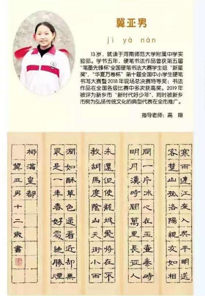 据悉,2019年冀亚男同学被选树为新乡市新时代好少年,同时被选为弘扬传统文化的 典型代表现场接受采访,发布会上展示的书法作品被新乡市文明办收藏存档,一些作品还在新乡市博物馆展出。冀亚男用自己的行动和取得的成绩,诠释了让自己争当一名具有社会主义核心价值观的好少年,她始终坚持让自己多一分努力,多一分行动,“扣好人生的第一粒扣子”,让自己积极成长为能担当民族复兴大任的新时代好少年。