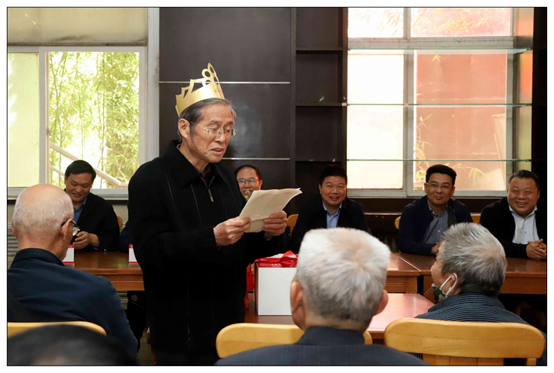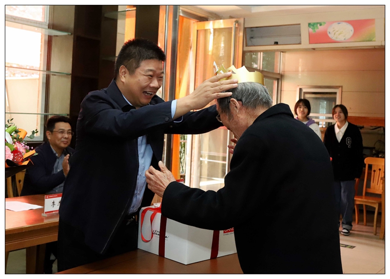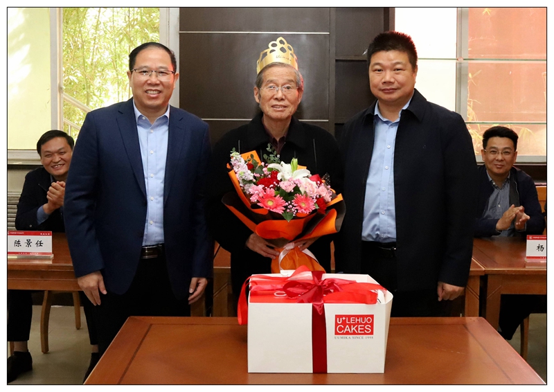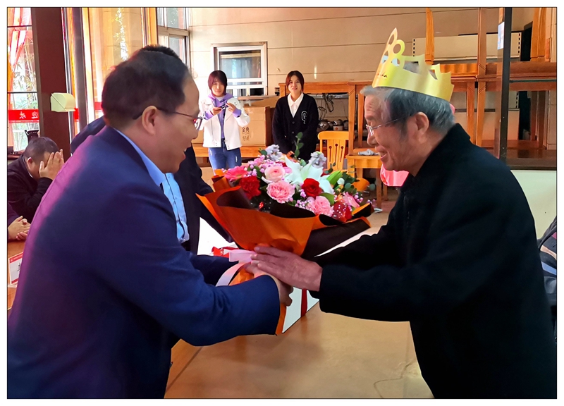 接着,大家一起为今年年满八十岁的老寿星卢德华老师祝寿。谢友海书记和李杰明副校长(主持工作)代表校领导班子为老寿星送上了鲜花和生日蛋糕,祝愿卢老师福寿安康,笑颜常驻,松鹤长春,寿比南山。
