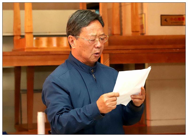 离退休党支部书记余保刚代表退休教职工发言。他十分感谢学校高度重视离退休工作,及时了解,关心关爱老同志的生活,帮助大家解决实际问题;同时,也号召广大离退休老同志关心学校发展,继续发挥余热、建言献策,努力做到离岗不离党,退休不褪色。发言最后,他用一副对联“(上联)新班子 新气象 新时代 新征程;(下联)有承扬 有创新 有担当 有作为;(横批)再创辉煌”表达了对学校新一届领导班子的美好祝愿。