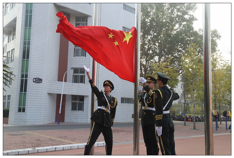 入场仪式完毕,国旗护卫队成员迈着铿锵的步伐,护送五星红旗到升旗台下。在雄壮的国歌声中,五星红旗冉冉升起,迎风飘扬。
