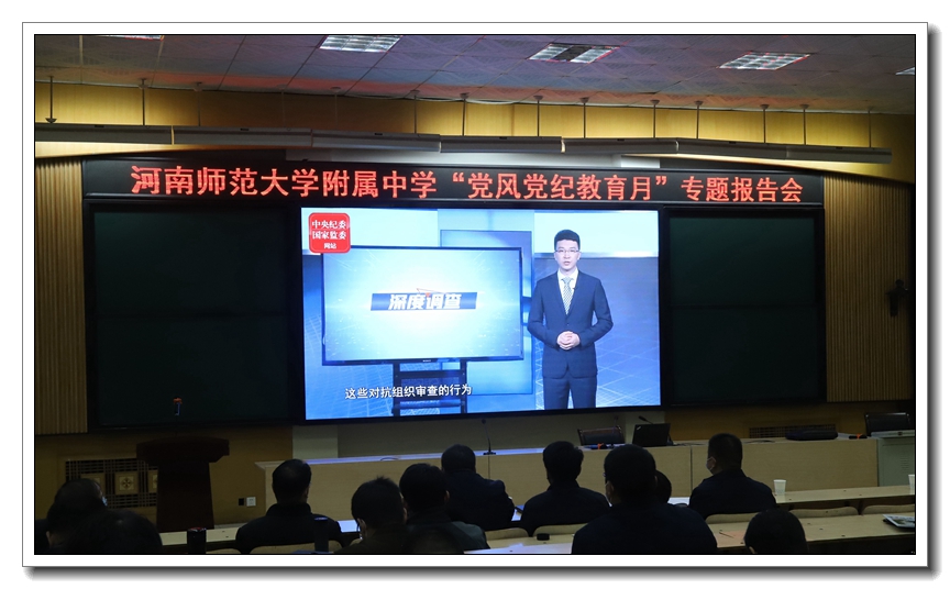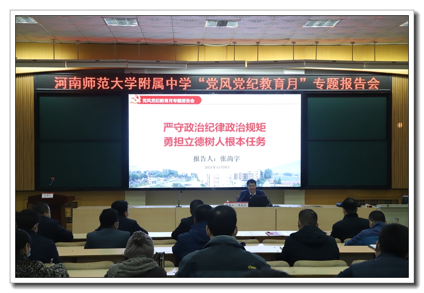 为深入学习贯彻习近平新时代中国特色社会主义思想、党的十九大和习近平总书记“七一”重要讲话精神,进一步加强党的政治建设,推动学校全面从严治党向纵深发展,11月9日,我校在教研办公楼四楼报告厅举办党风党纪教育月专题报告会,特邀河南省纪律检查委员会委员、河南师范大学党委常委、纪委书记、河南省监察委员会驻河南师范大学监察专员张尚字教授作专题辅导报告。校领导班子、中层干部、党支部书记及年级主任参加了会议。报告会由校党委书记谢友海主持。