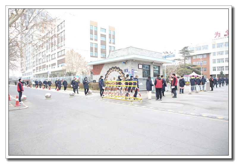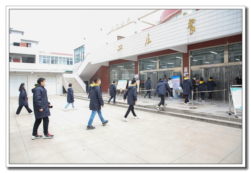 党员先锋岗教师、安保人员、班主任和班级安全员指挥师生有序列队,通过健康核验卡查验、测温、消毒后入校入班。