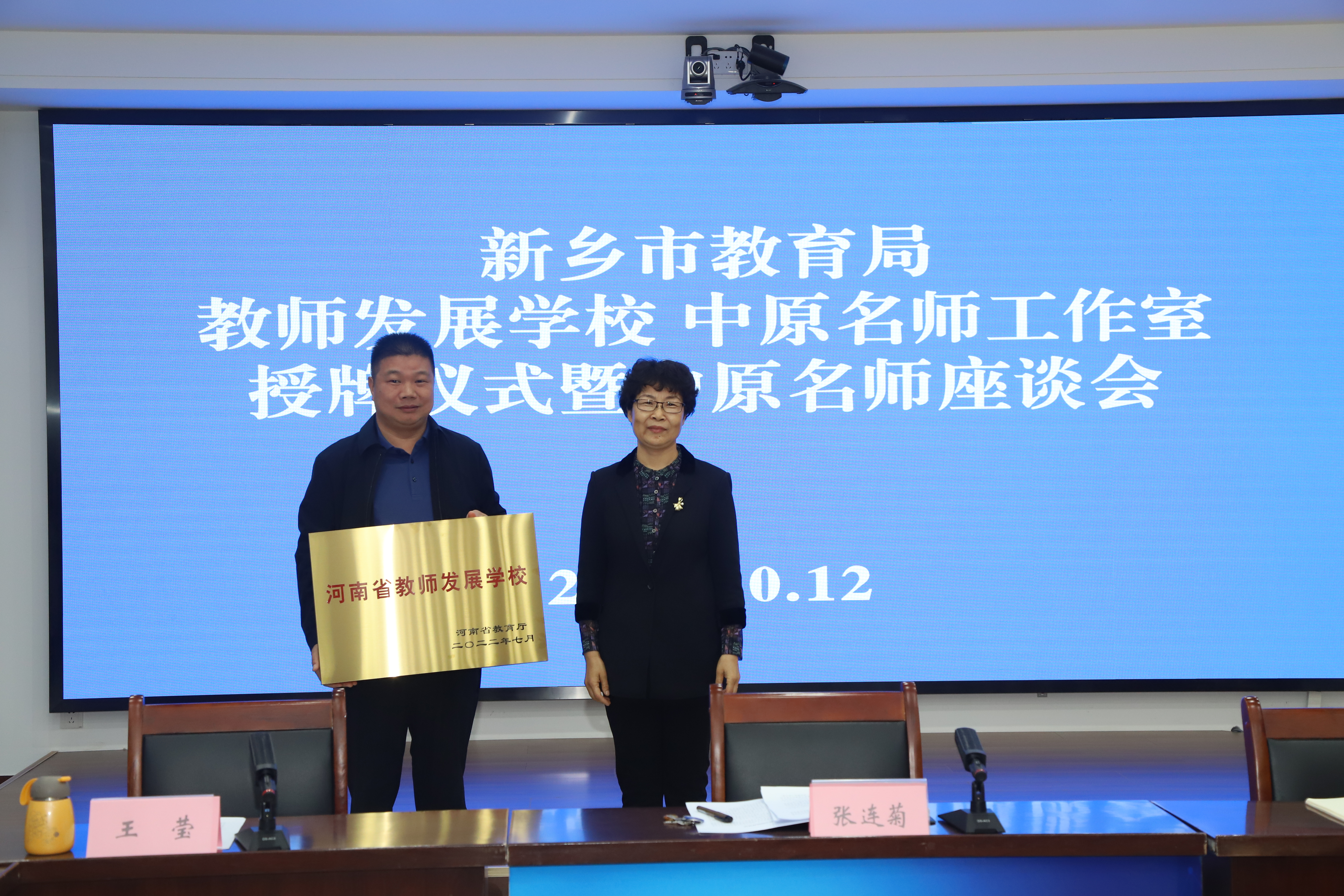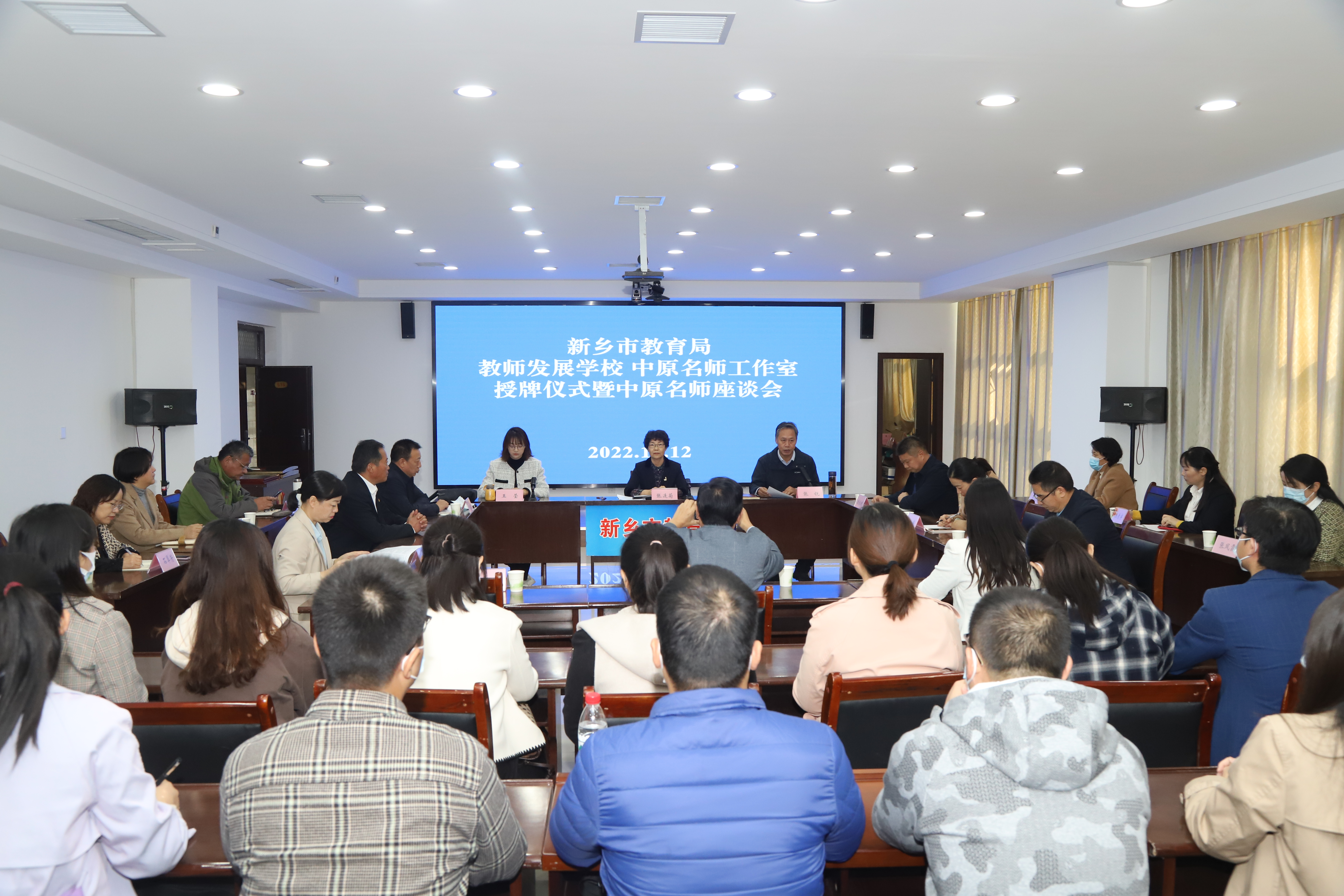 10月12日上午,新乡市2021年度河南省教师发展学校、中原名师工作室授牌仪式暨中原名师座谈会在教育局516室举行。新乡市教育局三级调研员张连菊,河南师范大学附属中学副校长(主持工作)李杰明等4位新认定的河南省教师发展学校校长和往届中原名师、2021年度中原名师及中原名师工作室研修员共同参加了授牌仪式,仪式由新乡市教育局教师教育科科长张锐主持。