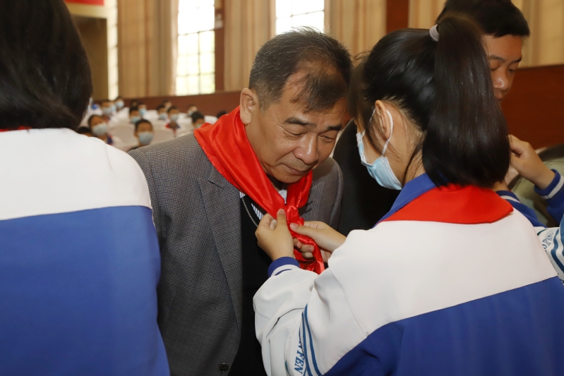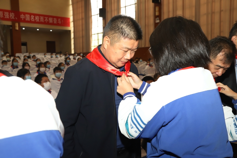 活动开始之前,我校初二年级少先队员代表为与会领导和嘉宾敬献红领巾。