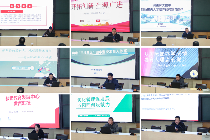 他强调,全校上下要对充分了解当前基础教育领域的重大变革和发展大势,勇担立德树人根本使命,积极落实师大党委对附中事业发展的更高期待,积极构建高质量育人体系,为学生全面发展、个性发展、终身发展奠基。他要求,全体教职工要立足岗位,履职尽责。一是不要空转,要突出实干,强调实效;二是不要瞎转,要把握政策导向,紧盯工作目标;三是不要胡转,要遵循管理规律,掌握科学方法。各级领导干部要引导好、服务好教育教学工作,把全校上下的智慧和力量凝聚到学校的改革发展上来,真正为附中争创第一、追求卓越服务,切实把学校建设成中原强校、中国名校。