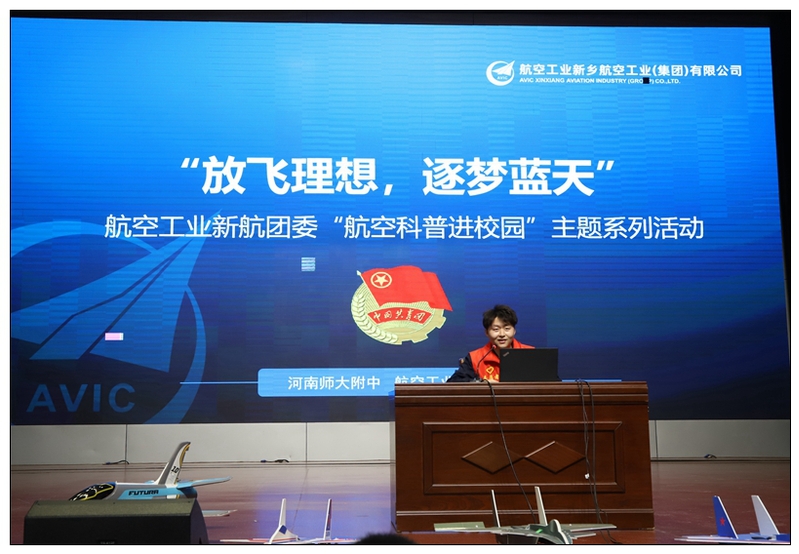 活动现场,航空工业新航集团“新航青年无人飞行器协会”秘书长胡佳鑫通过声情并茂的专业讲解结合图片视频的演示,让同学们对于人类“学飞”的历程以及各种飞机类型有了全面细致的了解,在广大青少年的心中埋下蓝天梦的种子,激发崇尚科学、热爱航空的热情和兴趣。讲座过程中,胡佳鑫还与同学们进行亲切提问互动,向积极回答问题的同学赠送航模纪念品。同学们纷纷举手发言,畅所欲言、表达观点,与老师积极开展讨论。现场氛围热烈高涨,同学们听得聚精会神,惊叹与掌声不断。
