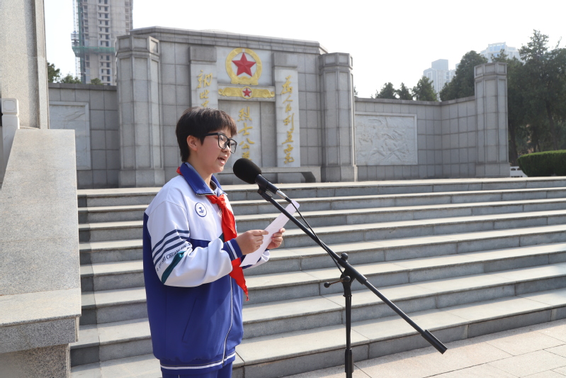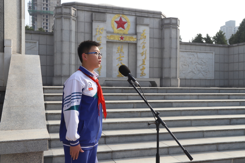 接着,少先队员代表初2102中队李念同学发言。她表达了对革命先烈英魂永驻的崇高敬意,并呼吁同学们要珍惜现在来之不易的和平生活,要懂得肩负的历史责任和使命,勤奋学习,砥砺前行,以无悔的人生告慰烈士英灵。