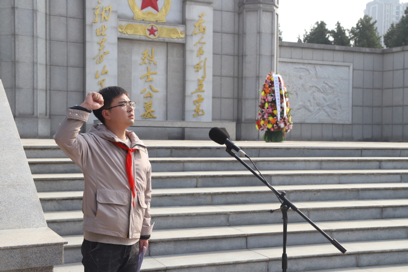 接下来,两名学生代表缓缓走到烈士纪念碑前,向革命先烈敬献花圈,整理缎带,寄托哀思。全体师生向烈士行三鞠躬礼。行礼完毕,徐炳鑫老师带领全体少先队员重温入队誓词,并庄严呼号。