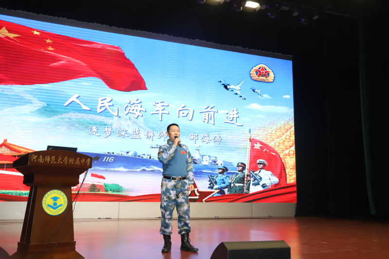 本次活动邀请到原海军北海舰队装备部上校军官、逐梦深蓝讲师团团长邹海涛为同学们讲述海洋国防知识。邹团长首先向同学们介绍了海军军服。接着,邹团长通过图片视频的展示向同学们介绍了国防建设相关情况,以及人民海军武器装备,特别是主战舰艇的发展进程,激发了同学们对海军的热情,提高了同学们对国防的认识。然后,邹团长通过讲述历史的对比、世界的现状、最新的时事进一步阐述了强国强军对国防事业的重大意义。