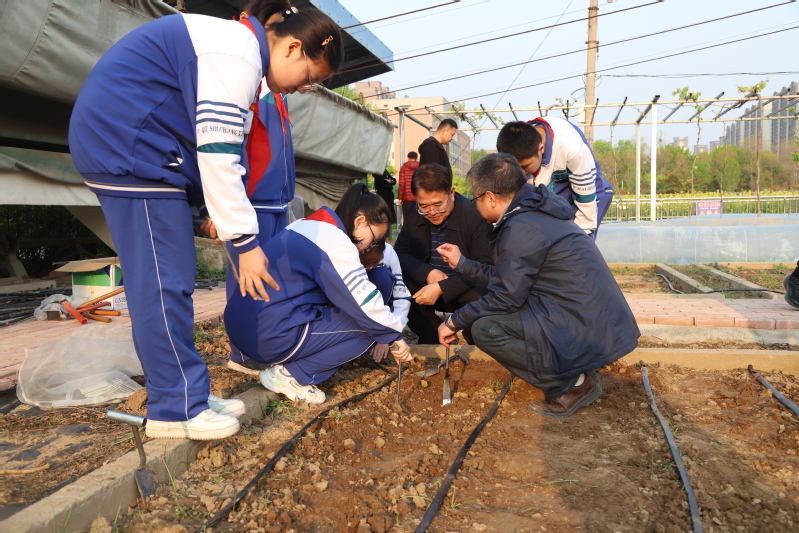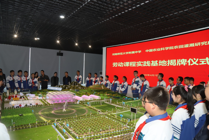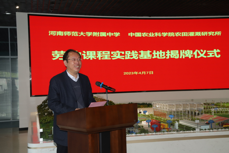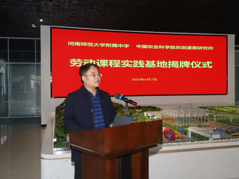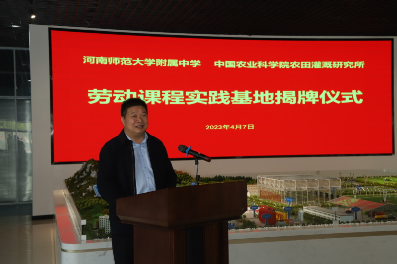 为加强劳动教育,锻造时代新人,努力打造独具特色的新时代劳动教育新模式,4月7日下午,河南师大附中与中国农科院农田灌溉研究所联合举行“劳动课程实践基地”揭牌仪式。莅临出席揭牌仪式的领导有:农田灌溉研究所所长周国民,党委委员、综合处处长朱东海,党委委员、期刊信息中心主任乔冬梅,科技处处长黄仲冬,党委办公室副主任宗洁;河南师大附中副校长(主持工作)李杰明,党委副书记、纪委书记、工会主席刘齐晋,副校长侯伟,德育处主任刘峰,学部副主任张自发,团委副书记陈文甫,生物学科教研组长吴彦军。师大附中初一年级师生代表共同参加揭牌仪式。仪式由刘齐晋主持。