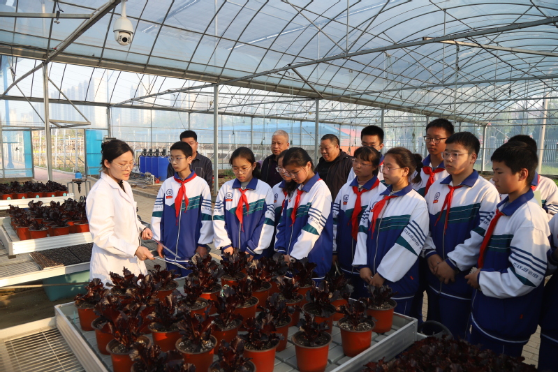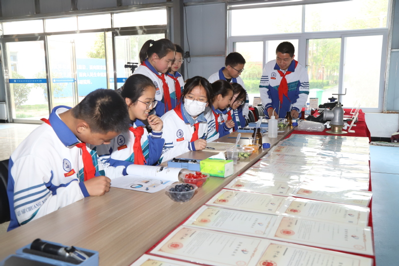 揭牌仪式结束后,领导师生共同参观了智慧灌溉技术展示沙盘、种子样品、新型灌溉设备等,接下来同学们在指导老师的带领下有序开展了水果糖分测定、玉米种植等一系列劳动课程实践活动。
