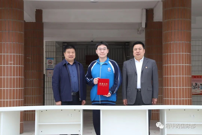 张银付书记、李杰明校长向职世卓同学颁发证书