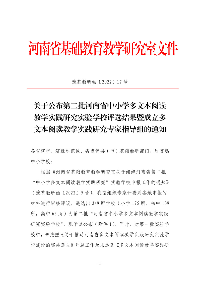 多文本阅读教学是相较于单篇阅读教学而兴起的一种新型阅读教学模式,它旨在改进语文课堂单篇精读、个别片段条分缕析的教学现状,在阅读形式上将多个文本进行结构化组合,给学生营造相对复杂的阅读情境,通过议题的引领,让学生在多个文本的阅读过程中搜集、提炼文本的精髓要义,尝试发现并总结规律。多文本阅读教学的开展,能够促进学生阅读能力的形成,达到培养学生的语文核心素养的目的。近年来,我校积极组织语文教师参加省、市多文本阅读教学理论研修活动,并主动申请,于2022年9月获准成为河南省第二批多文本阅读实验学校。