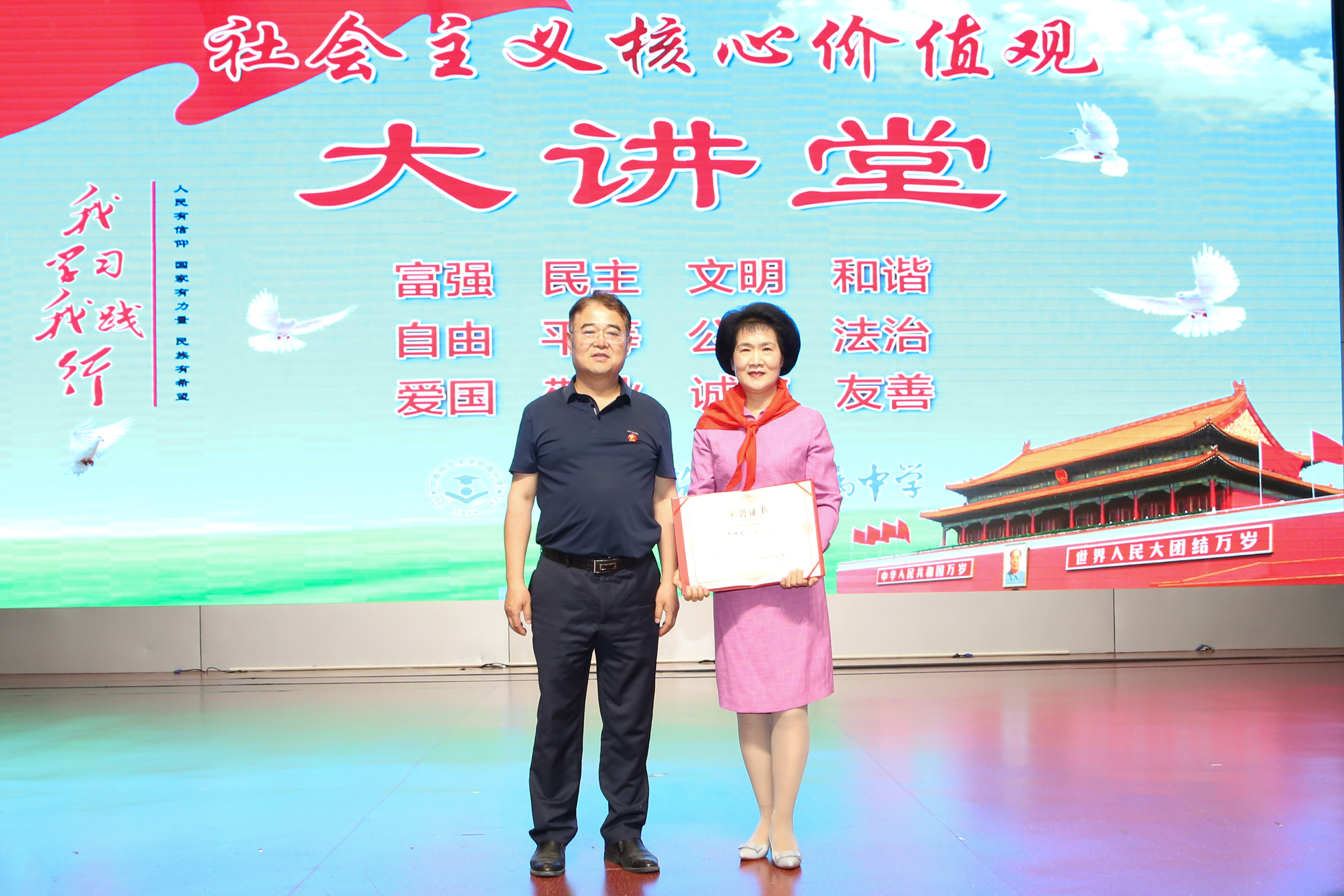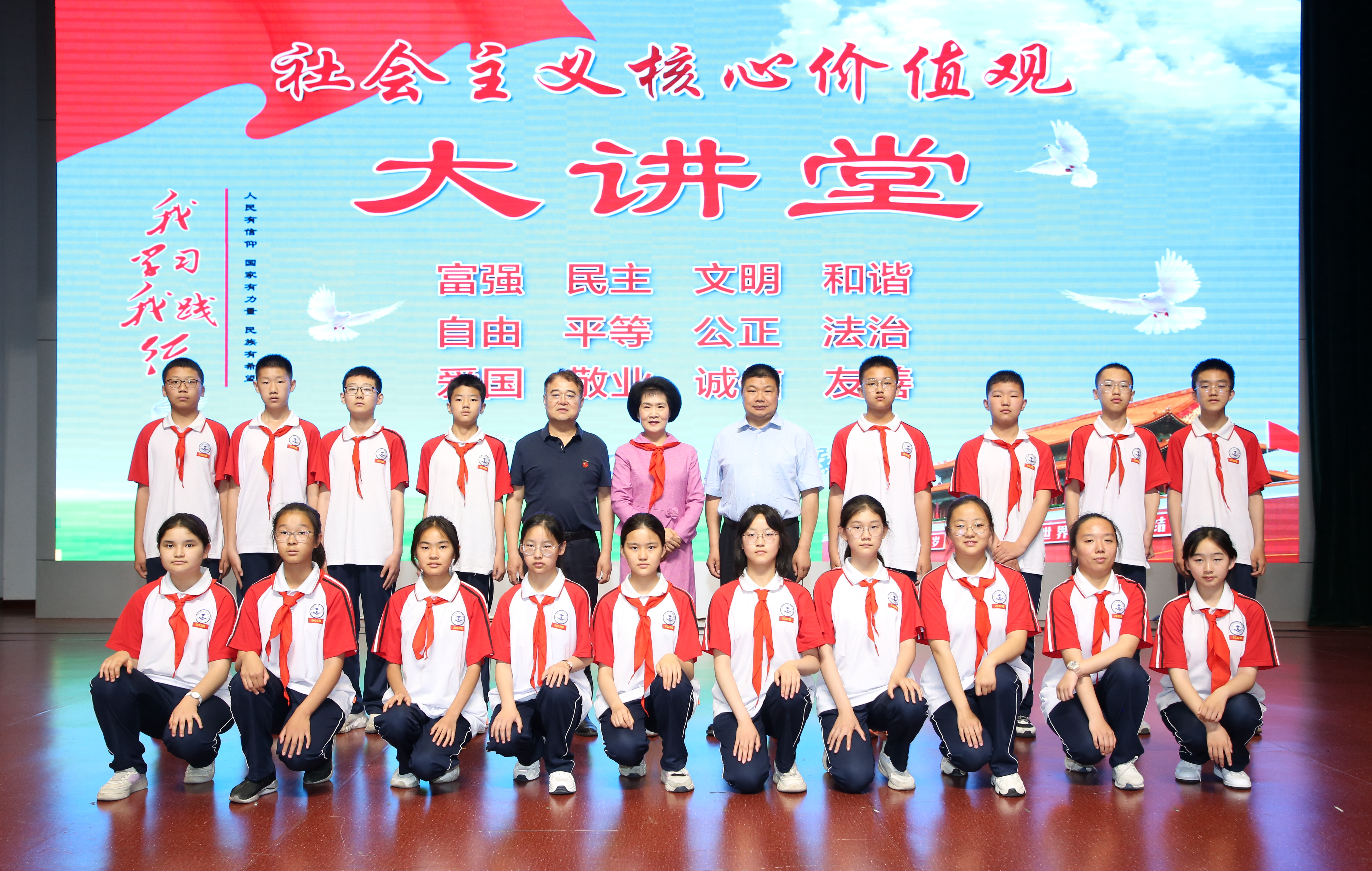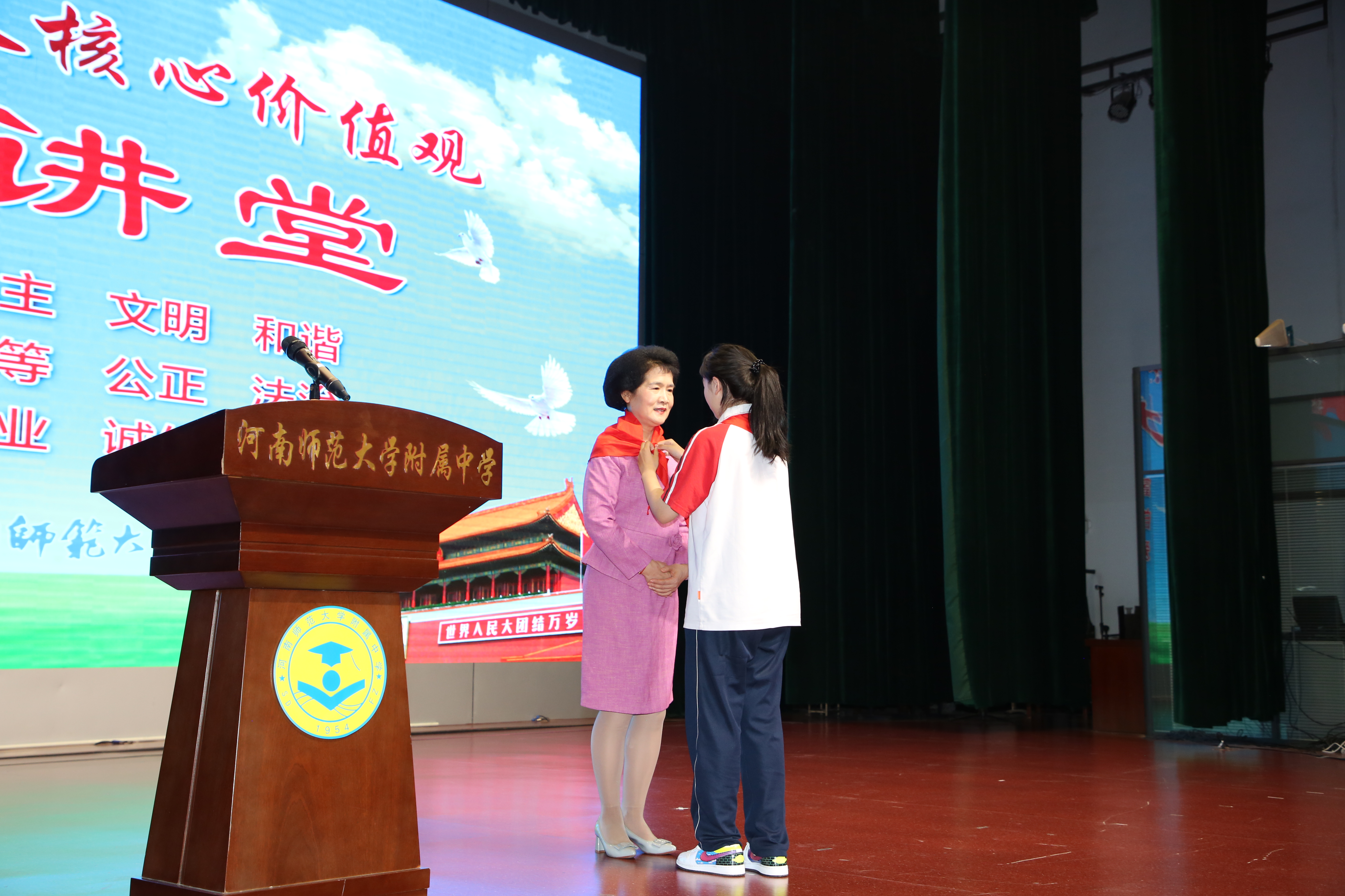 本次社会主义核心价值观大讲堂活动伊始,在全场热烈的掌声中,少先队员代表为买世蕊佩戴红领巾,校党委副书记、纪委书记、工会主席刘齐晋向买世蕊颁发“校外思政课辅导员”聘书。