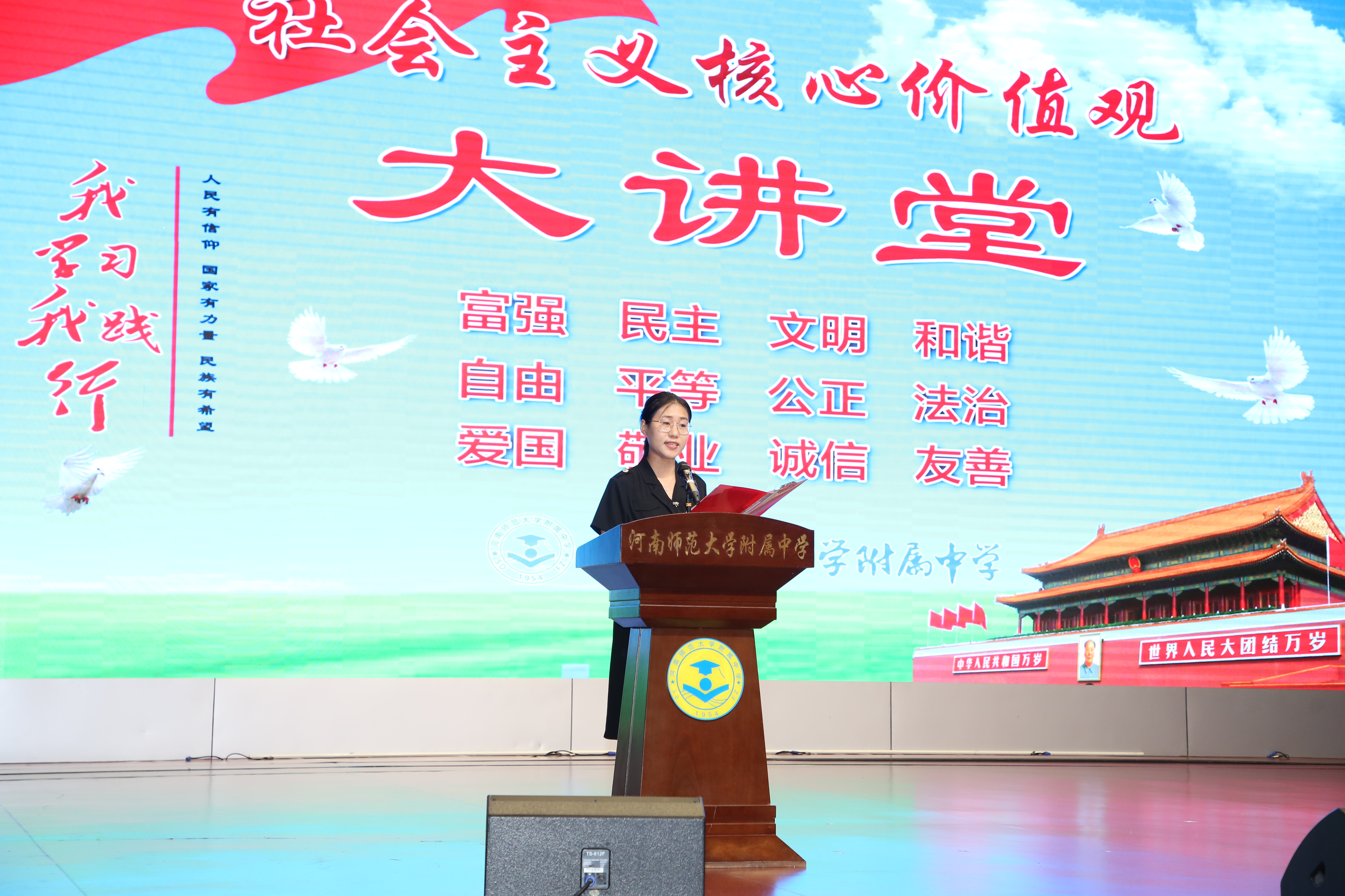 5月18日上午,全国人大代表买世蕊女士莅临我校,开展社会主义核心价值观大讲堂——文明篇宣讲活动。校领导李杰明、刘齐晋出席活动,学校相关部门负责人、初一年级师生代表共计400余人参加了活动。大讲堂活动由李园园老师主持。