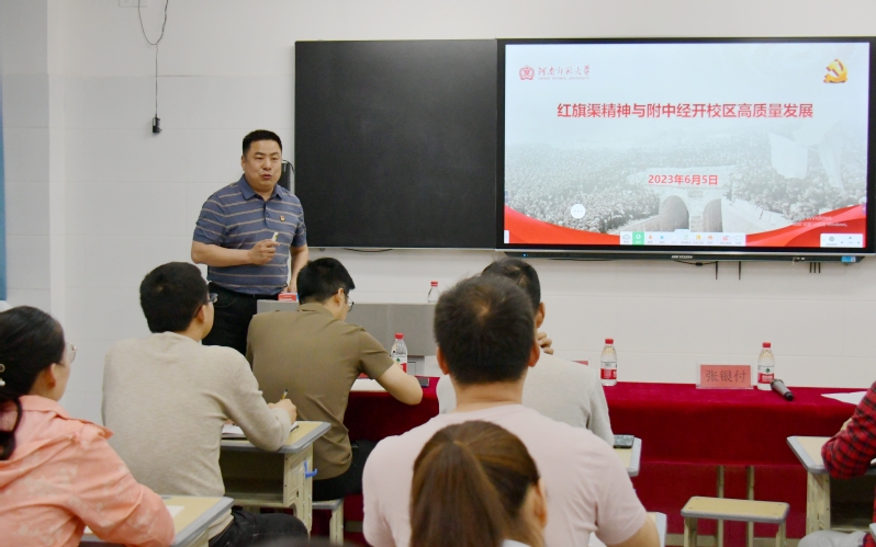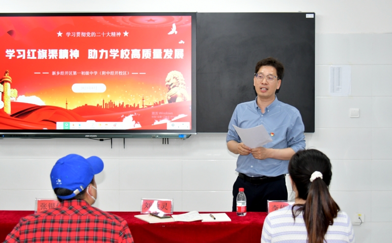 为深入学习贯彻党的二十大精神,认真落实习近平总书记在红旗渠考察时的重要讲话精神,6月5日,校党委书记张银付为新乡经开区第一初级中学(附中经开校区)全体教师上思政课。活动由附中经开校区校长刘敏灵主持。