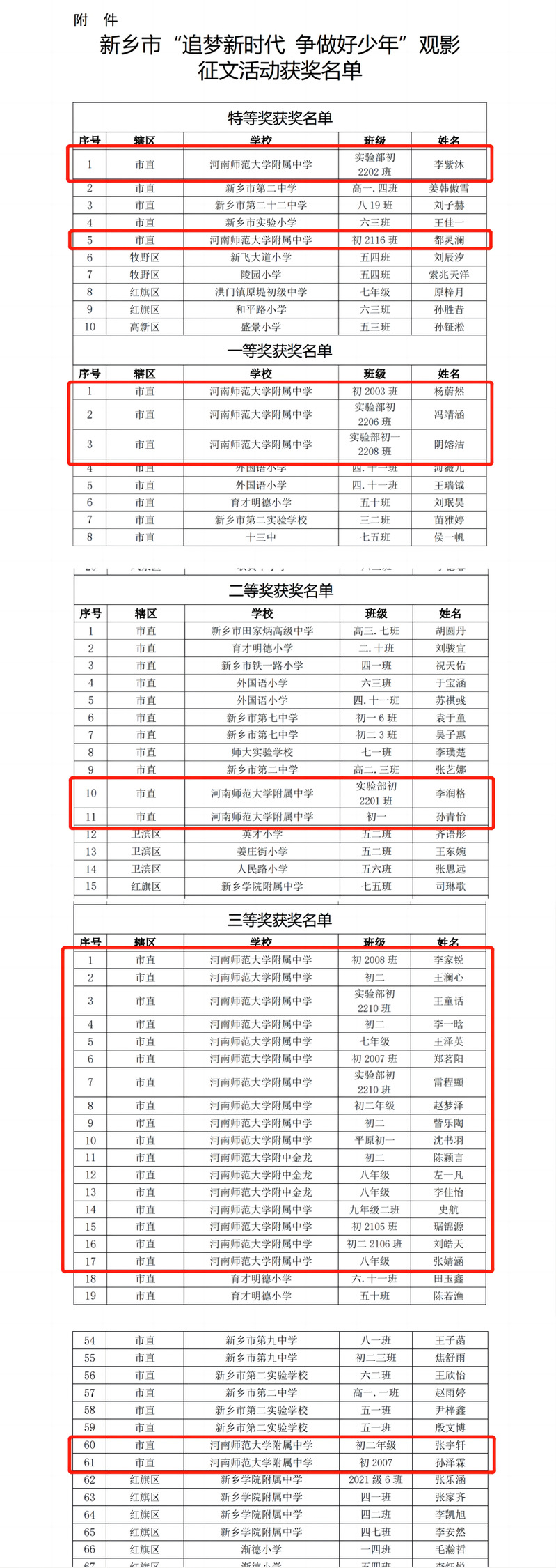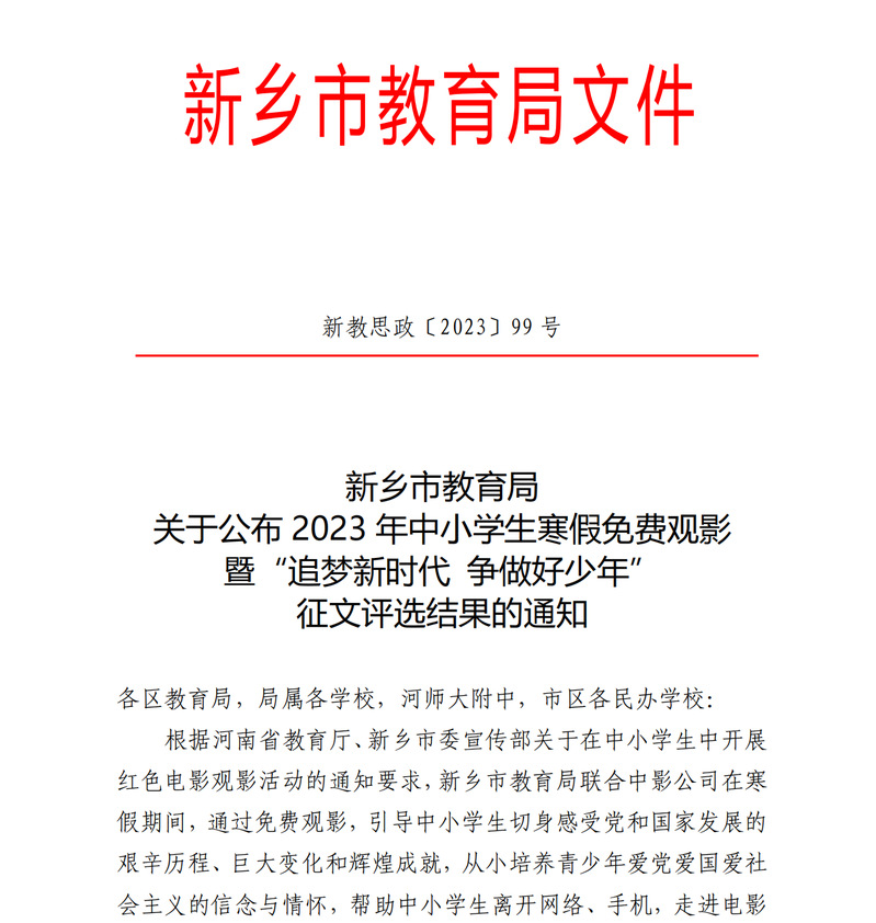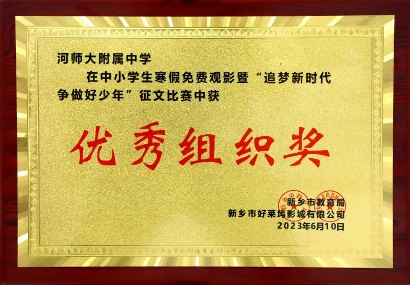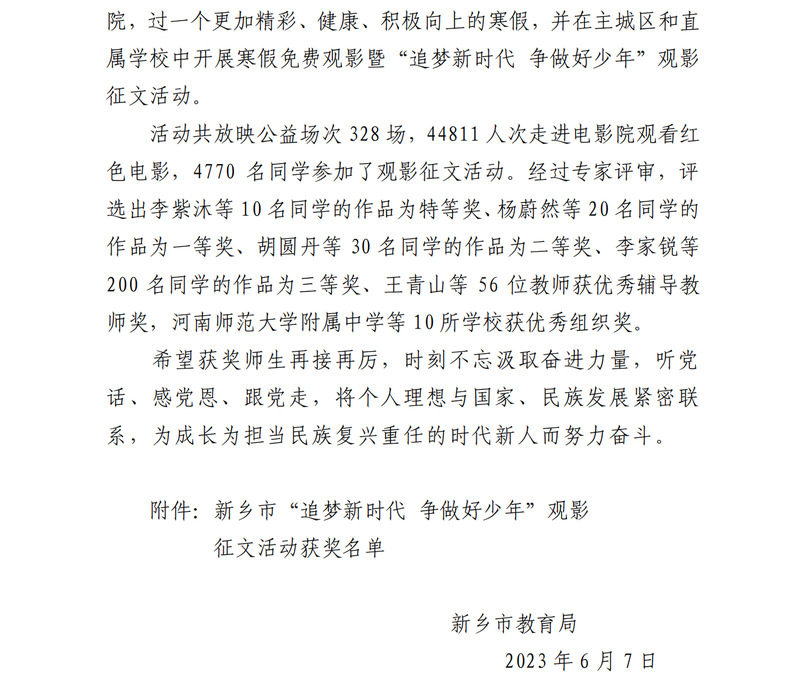 我校多名同学在新乡市教育局举办的2023年中小学生“追梦新时代 争做好少年”征文比赛中荣获佳绩!我校荣获“优秀组织奖”!