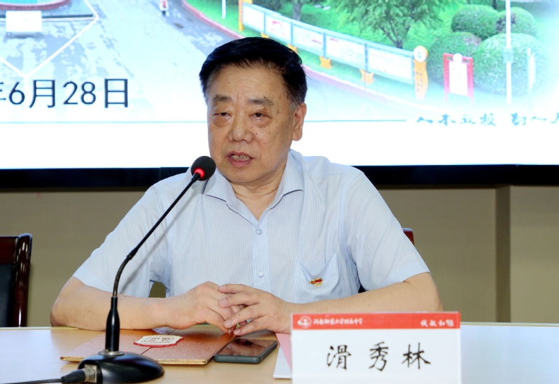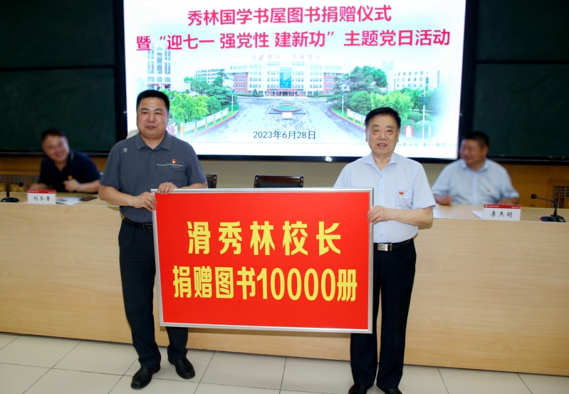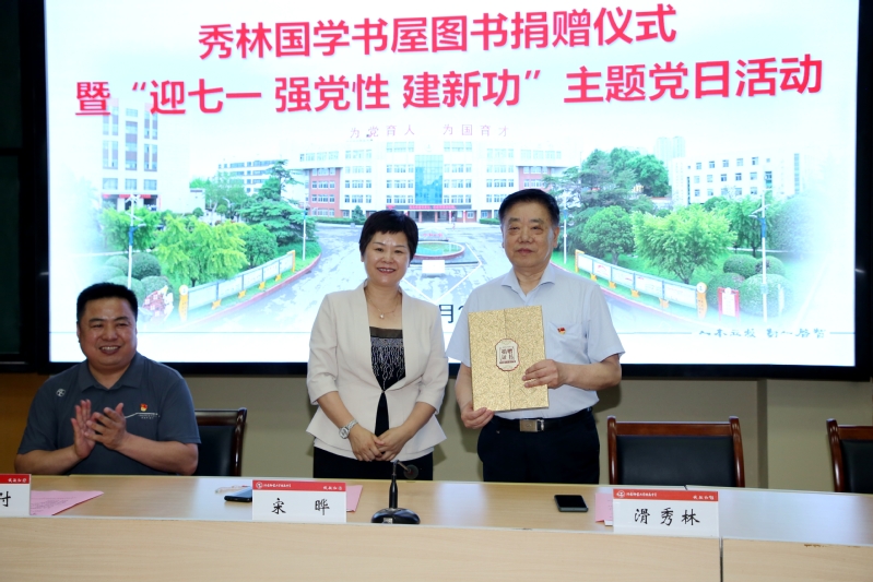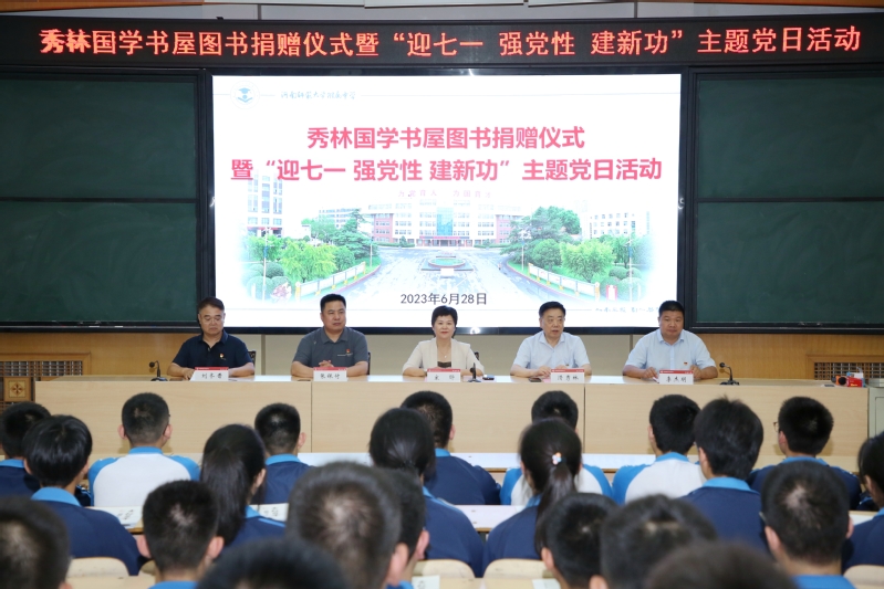 在即将迎来中国共产党成立102周年之际,6月28日下午,我校在教研办公楼四楼报告厅举行秀林国学书屋图书捐赠仪式暨“迎七一 强党性 建新功”主题党日活动。新乡市政协副主席、河南师范大学副校长宋晔,我校原校长、原党委书记、名誉校长滑秀林,校领导张银付、李杰明、刘齐晋出席活动。相关部门负责人、各党支部书记、各分工会主席、图书馆全体职员、博雅文史学社等国学社团的学生代表参加活动。仪式由校工会副主席、校办公室副主任崔彦芳主持。
