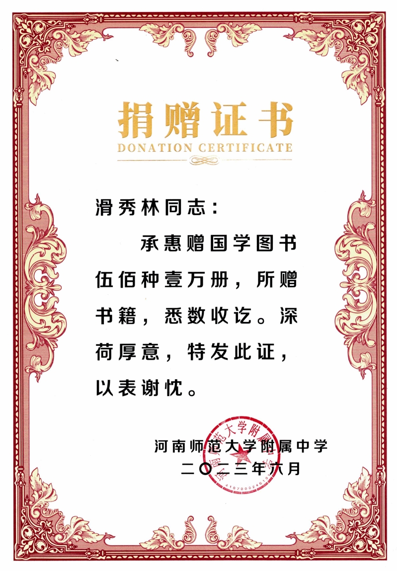 接下来进行国学图书捐赠。校党委书记张银付代表学校接受滑秀林校长捐赠。新乡市政协副主席、河南师范大学副校长宋晔为滑秀林校长颁发捐赠证书。