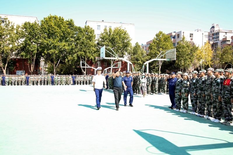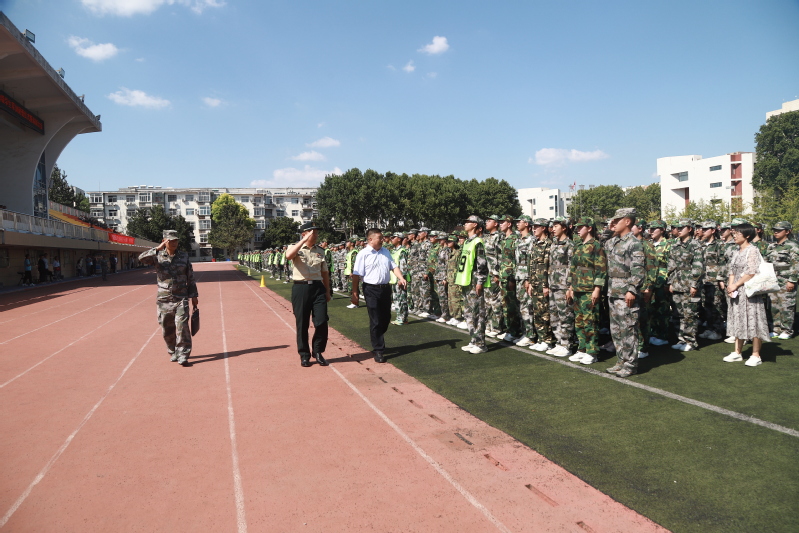 伴随着激昂的检阅进行曲,施训单位领导和校领导共同检阅了新生军训队伍。
