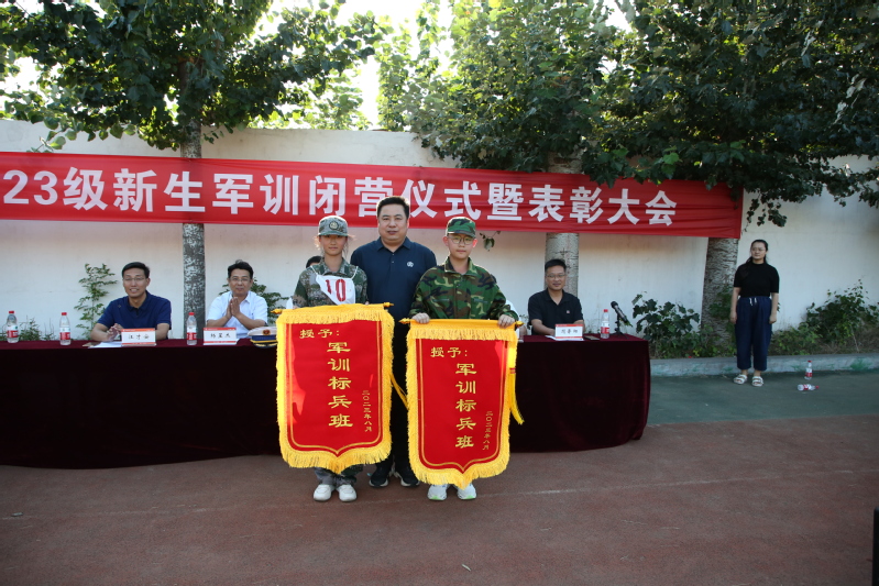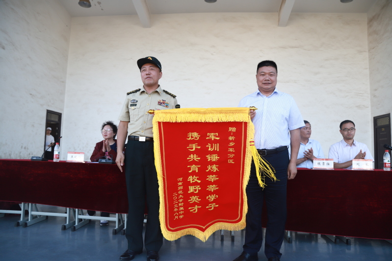 最后,学校领导向施训单位赠送锦旗,向不畏艰苦、严格施训、与同学们同甘共苦的全体教官表达崇高的敬意和衷心的感谢。
