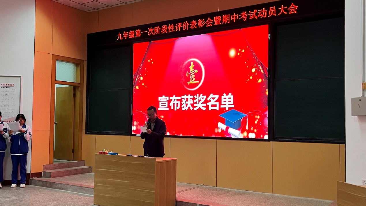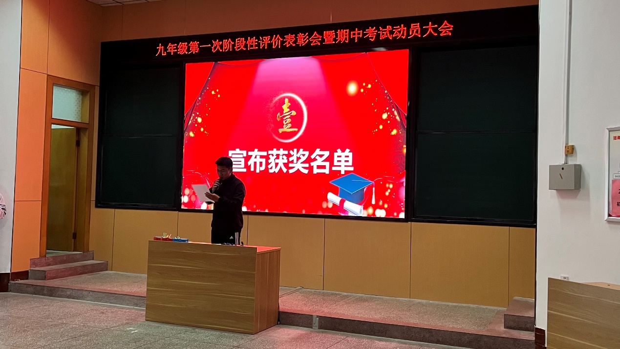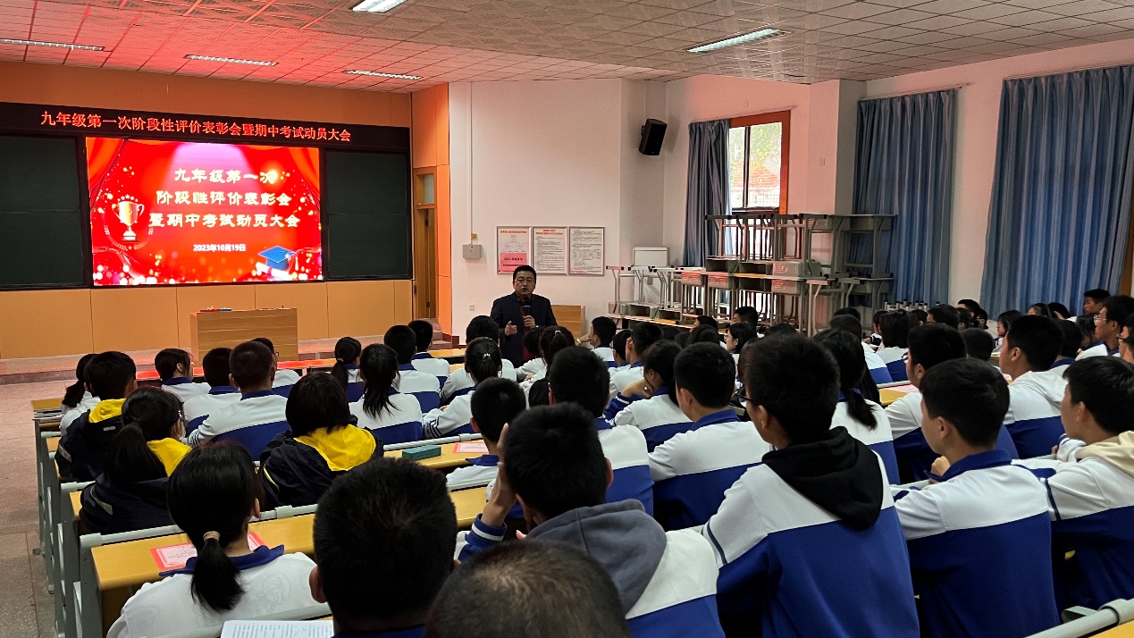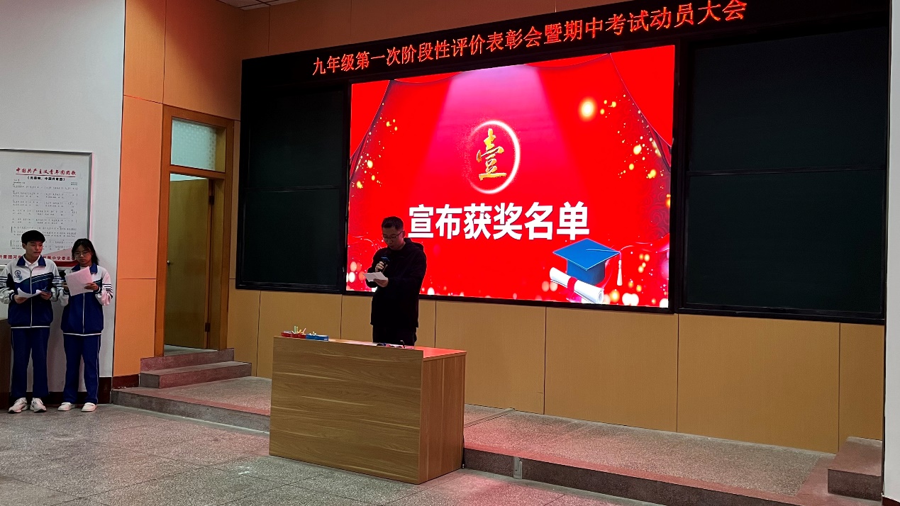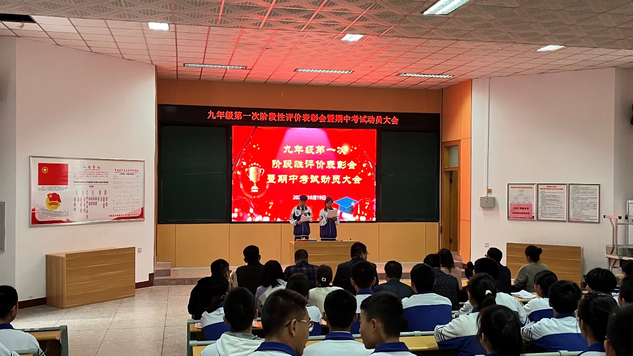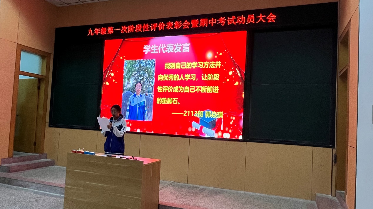 为总结经验,树立榜样,找出差距,迎战期中,10月19日上午,初中部2021级在西校区逸夫楼阶梯教室举行九年级第一次阶段性评价表彰会暨期中考试动员大会。初中部副主任刘晨曦、初三年级主任伍群、副主任谢高通、刘天瑜,初三年级全体班主任和各班学生代表参加此次活动。活动由初2113班郭雨祺、李冰主持。