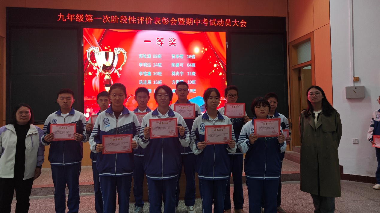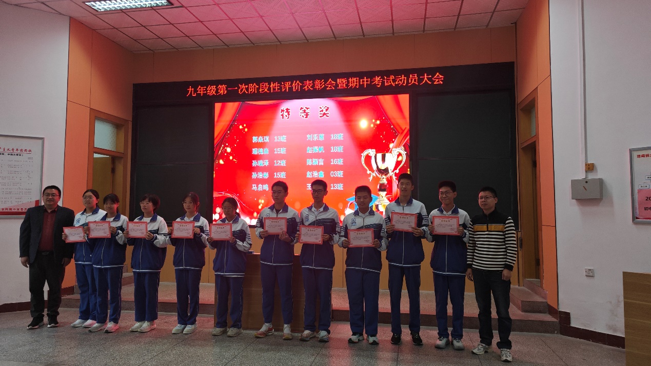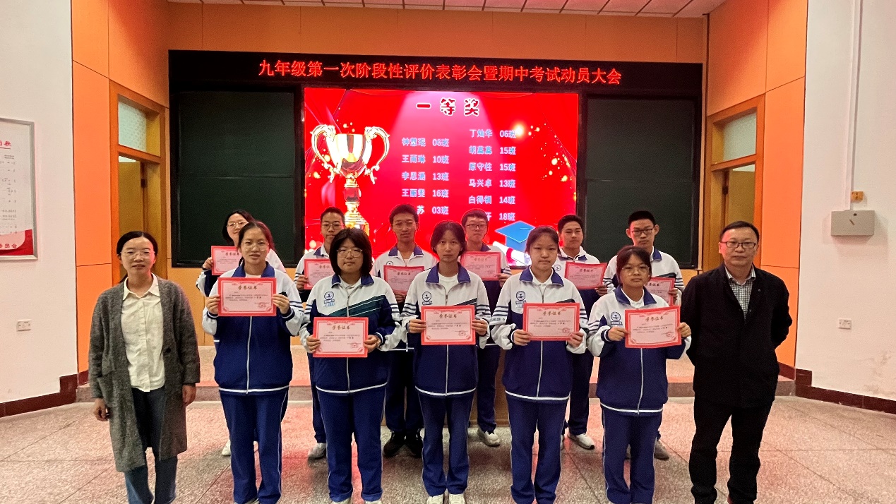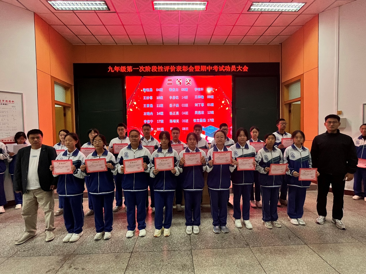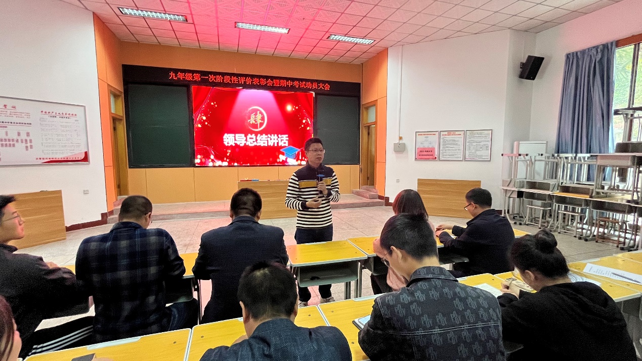 为总结经验,树立榜样,找出差距,迎战期中,10月19日上午,初中部2021级在西校区逸夫楼阶梯教室举行九年级第一次阶段性评价表彰会暨期中考试动员大会。初中部副主任刘晨曦、初三年级主任伍群、副主任谢高通、刘天瑜,初三年级全体班主任和各班学生代表参加此次活动。活动由初2113班郭雨祺、李冰主持。