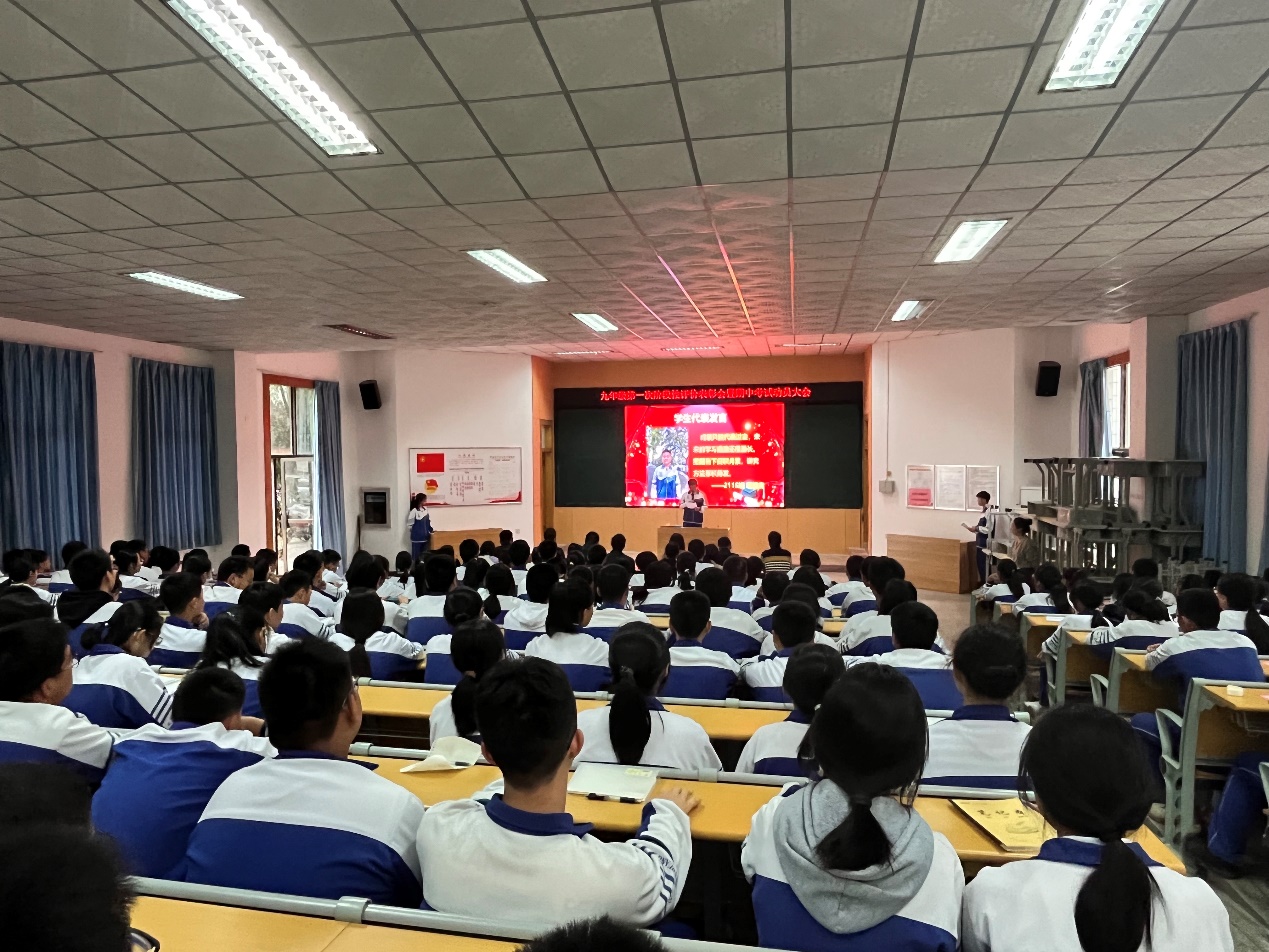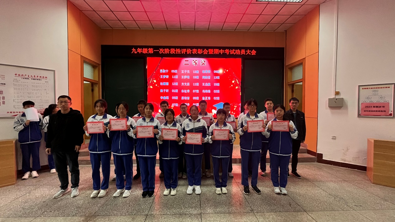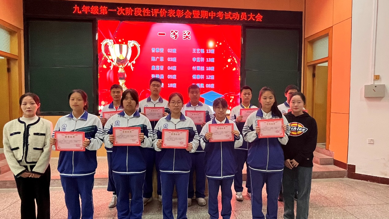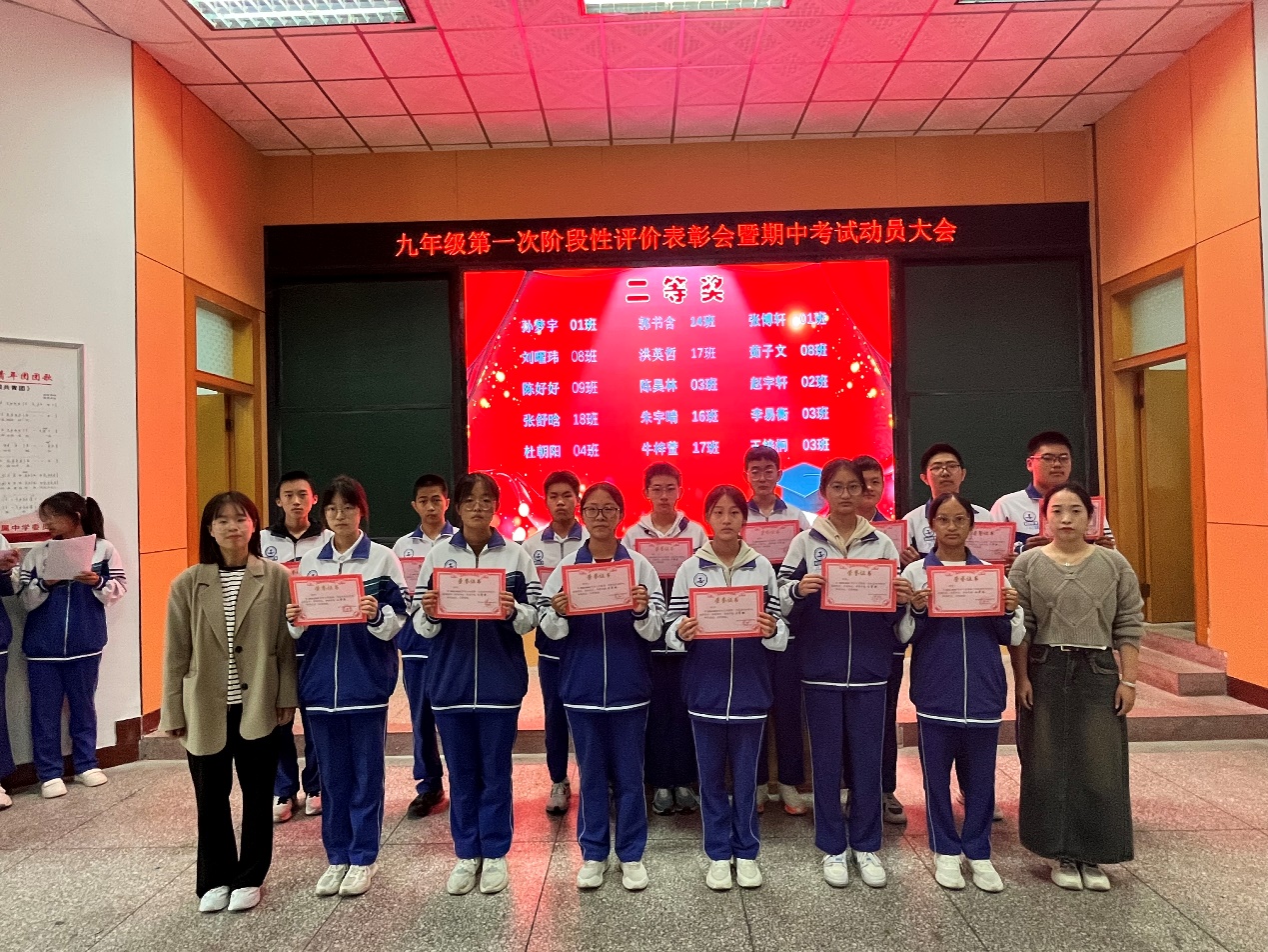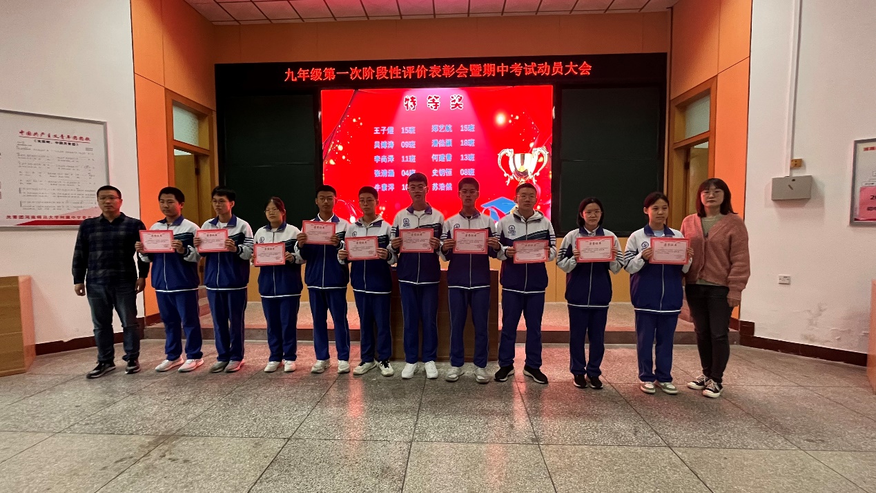 为总结经验,树立榜样,找出差距,迎战期中,10月19日上午,初中部2021级在西校区逸夫楼阶梯教室举行九年级第一次阶段性评价表彰会暨期中考试动员大会。初中部副主任刘晨曦、初三年级主任伍群、副主任谢高通、刘天瑜,初三年级全体班主任和各班学生代表参加此次活动。活动由初2113班郭雨祺、李冰主持。