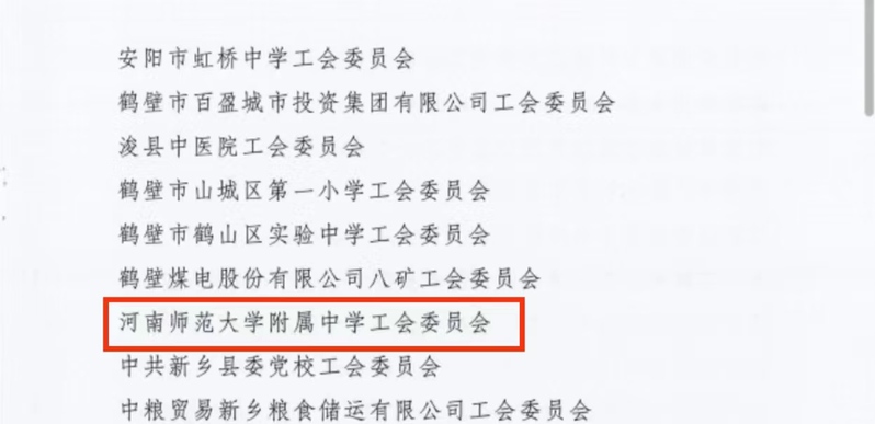 近日,河南省总工会发布通知,在全省范围内命名了一批基层工会规范化建设示范点,其中“国有、集体企业和事业单位工会示范点”共142家,我市5家单位工会组织获评,我校工会作为新乡市唯一的中小学工会名列其中。