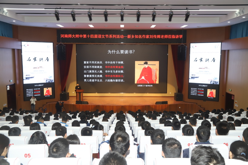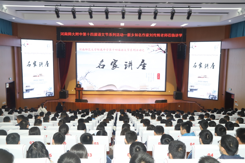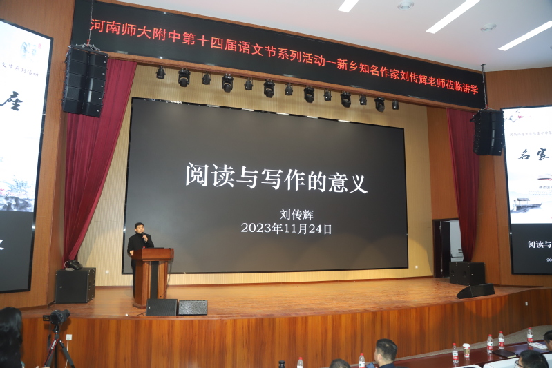 11月24日上午,我校邀请新乡知名作家刘传辉老师做客语文节活动。校领导杨呈杰、陈景任出席活动,相关部门负责人以及高二年级师生代表500余人参加活动,活动由语文组范灵营老师主持。