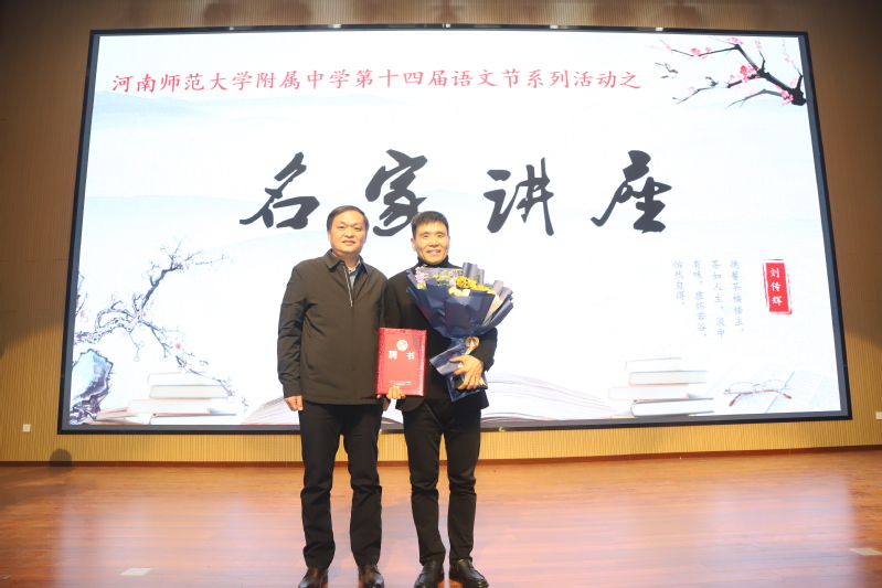 讲座结束后,副校长陈景任为刘传辉老师颁发“校外辅导员”聘书。