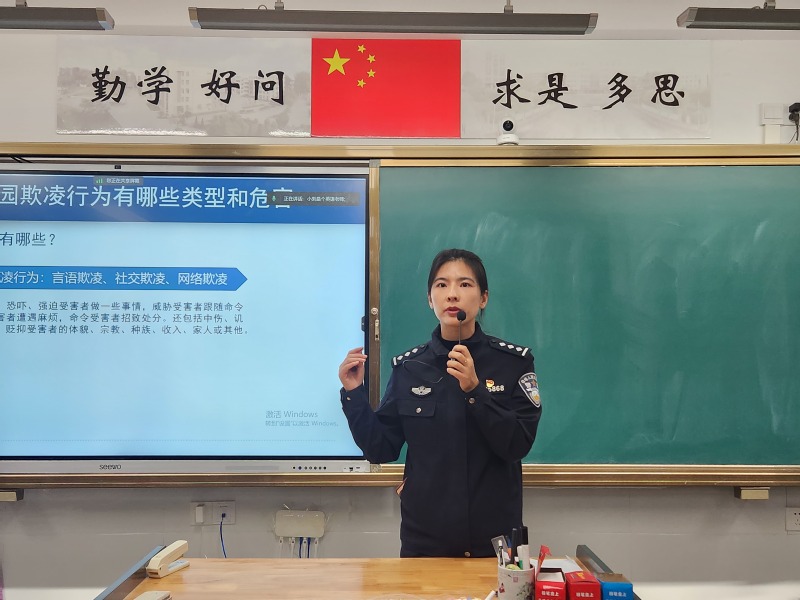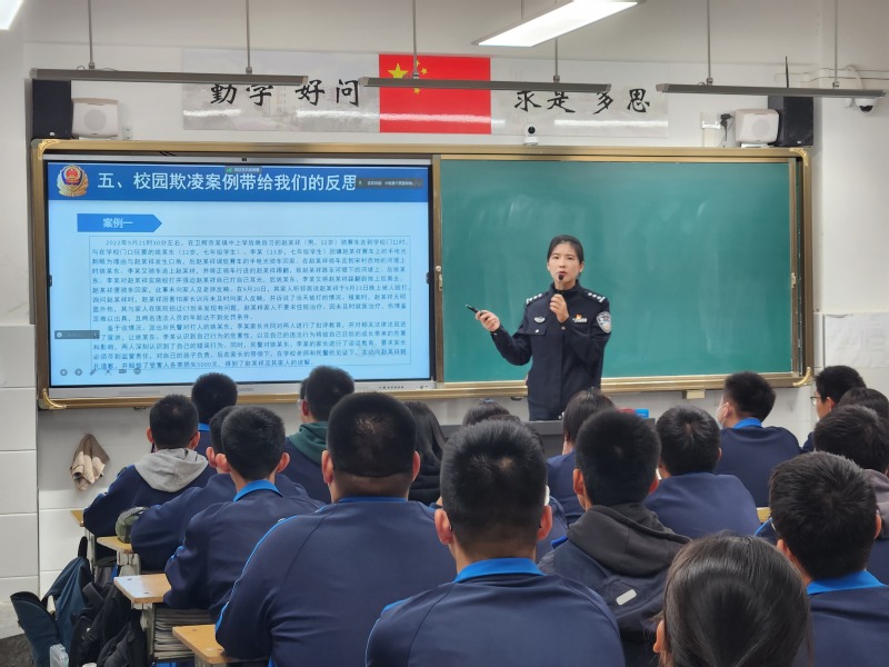 段警长深入浅出、以案例演绎式的讲解,让同学们对校园暴力有了更深刻的理解,本次法治活动,帮助同学们牢固树立防欺凌安全意识,对一切暴力行为说“不”,增强学生的法治观念和自我保护意识,还青春一纯净蓝天,让校园充满爱。